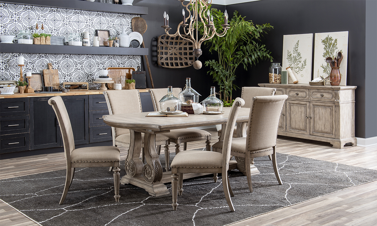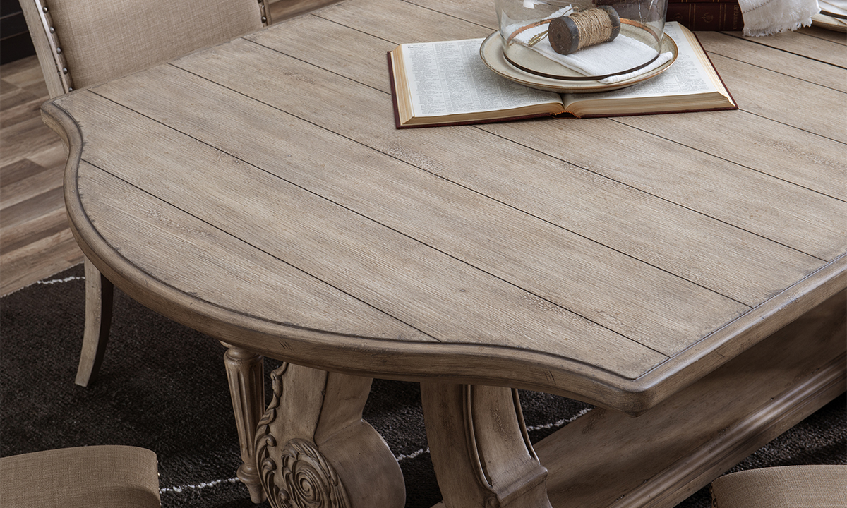 Table includes (2) 18-inch extension leaf to expand from 84 to 120-inches wide