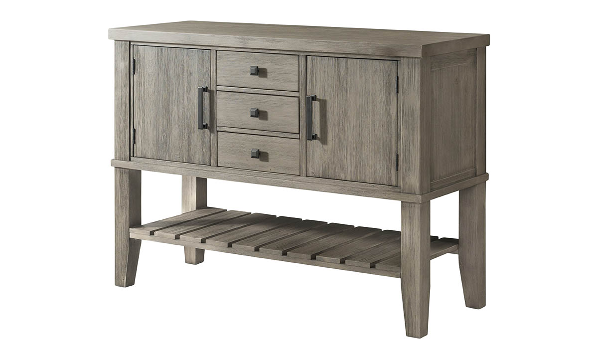 Enhance your dining storage with the gorgeous and functional 2 Door 3 Drawer Buffet. Crafted from solid acacia wood, it features a distressed gray 7-step finish, and a felt-lined top drawer.