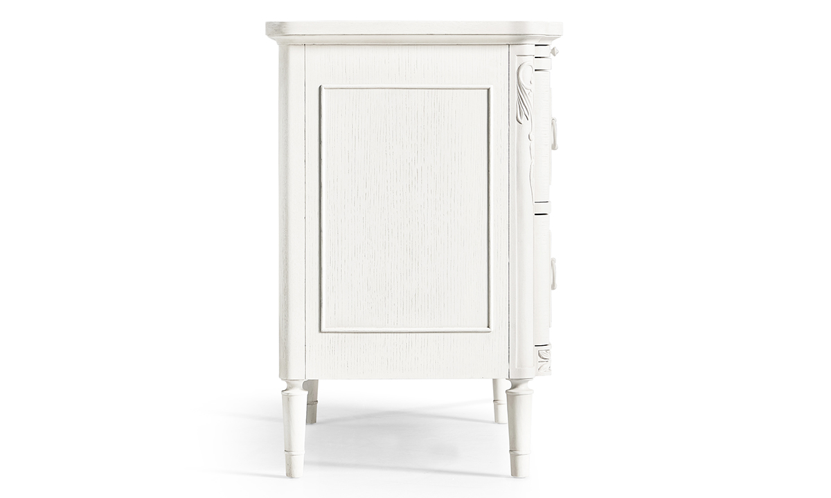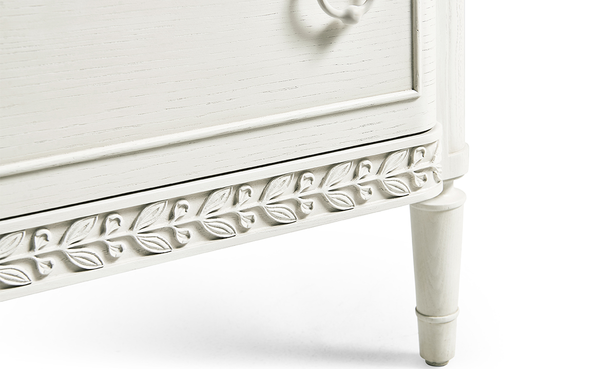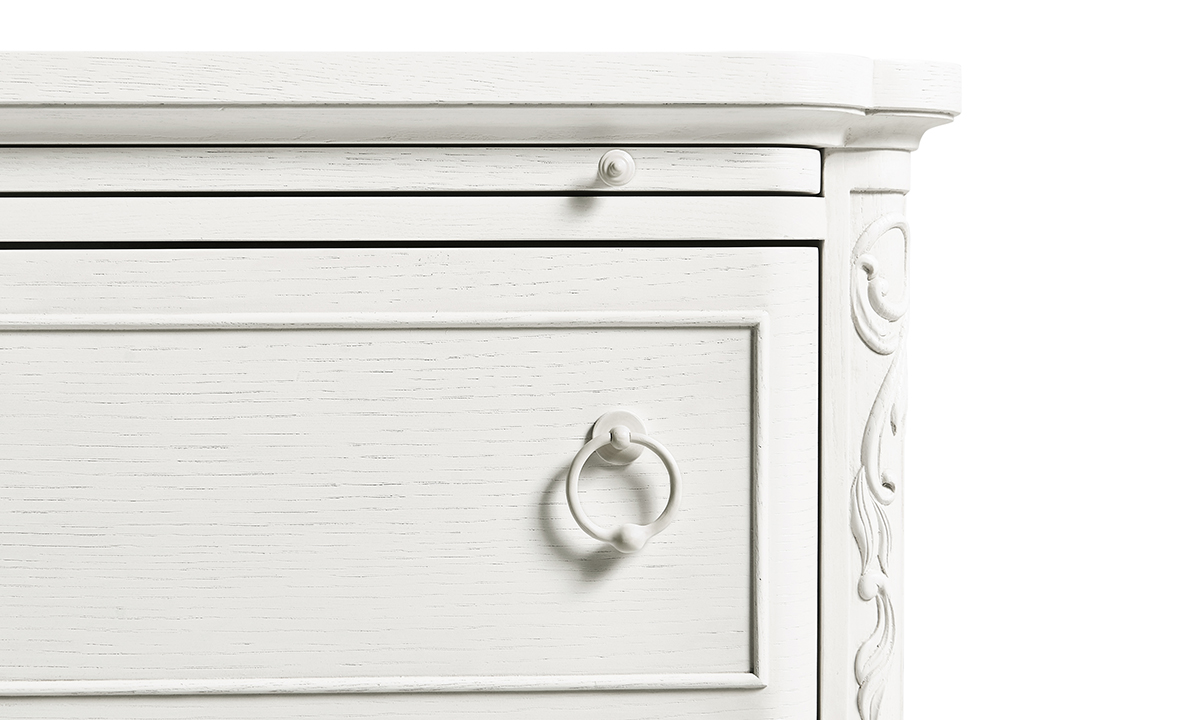 Artful hand carved floral motif across serpentine drawer
