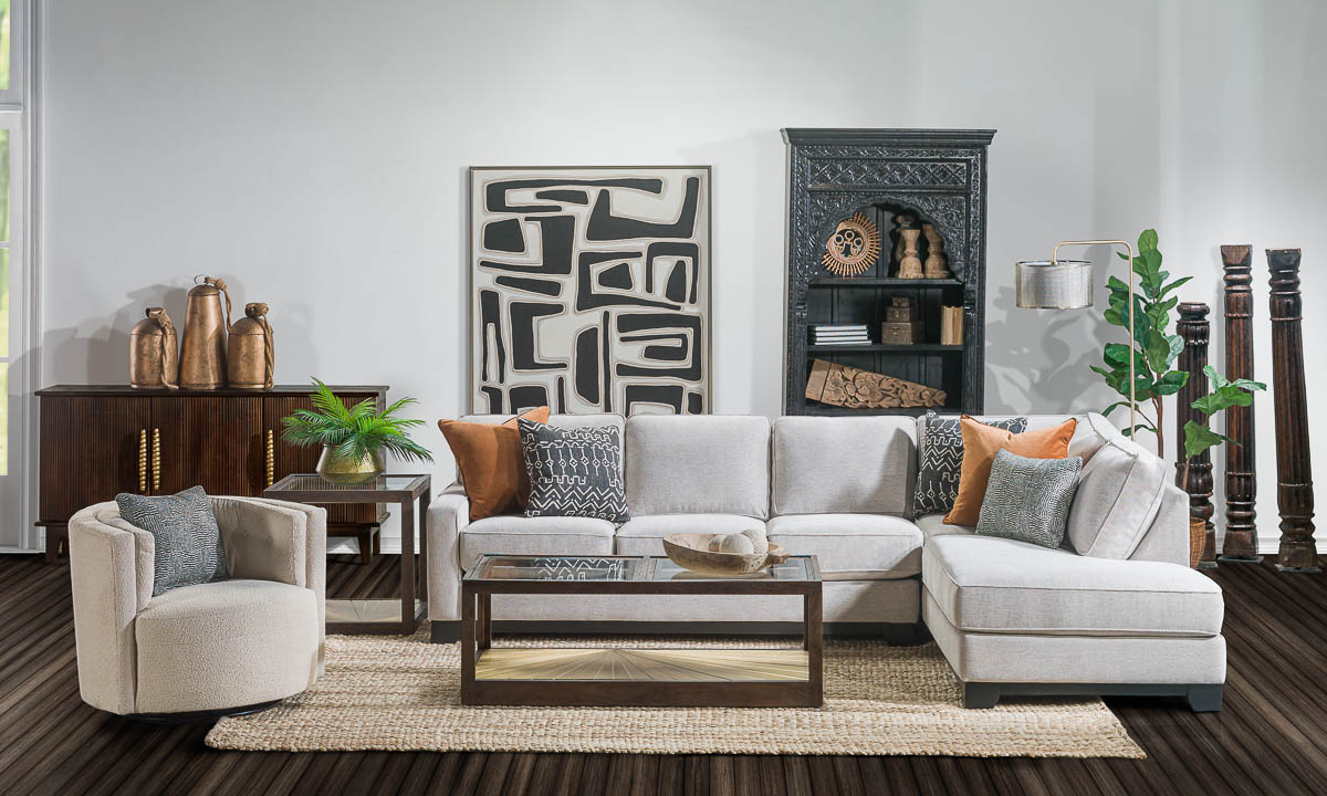 Crafted in America for lasting durability, this two-piece sectional with toss pillows features soft, premium fabric upholstery in a merit dove hue