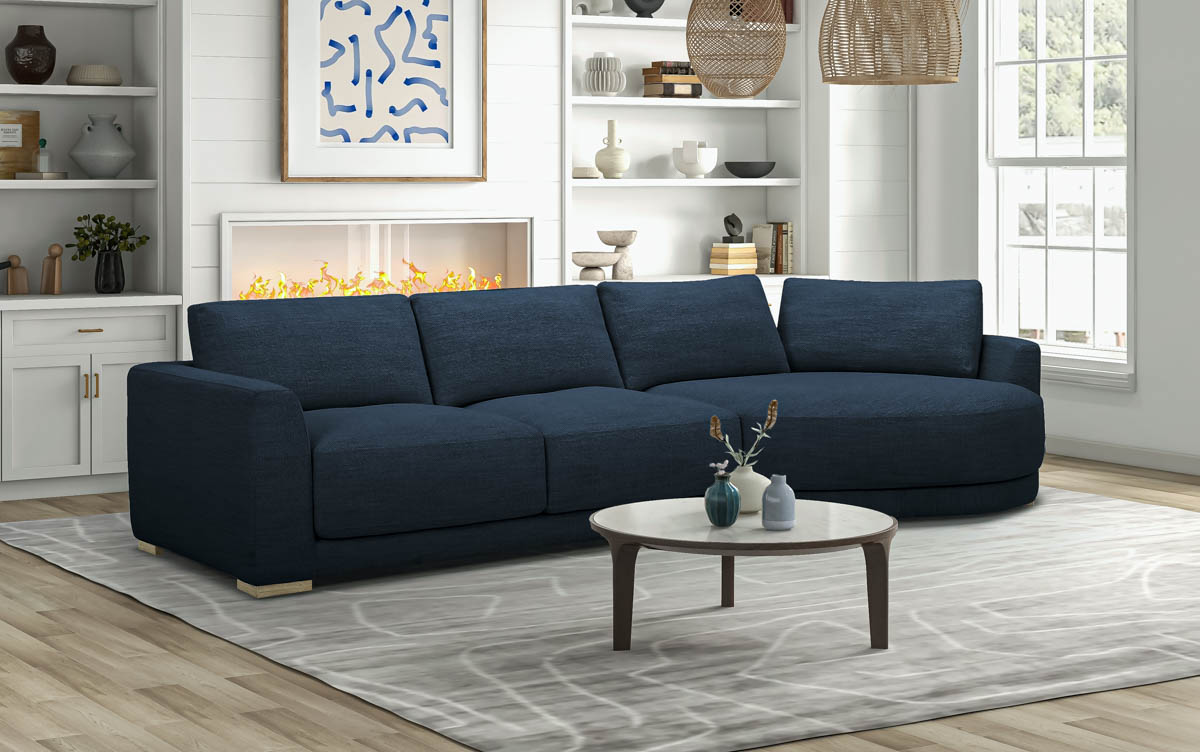 Elevate your living space with the Solaris Indigo Sectional, featuring luxurious Effie Indigo performance fabric, feather and down comfort, and a robust sinuous spring system for ultimate relaxation.