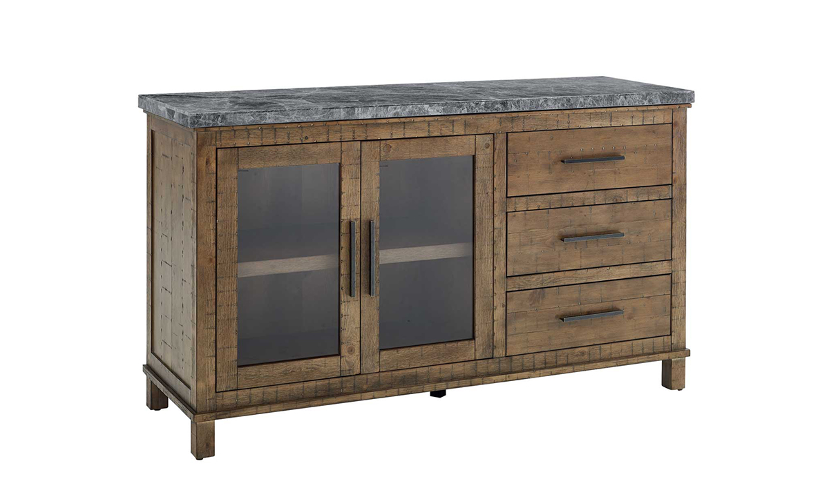 Enhance your dining space with the Grayson Gray 2-Door Server. Crafted from hardwood solids, it features a dusty honey wood finish with a gray top. With three drawers and a two-door server housing an adjustable shelf, this elegant piece offers both style and functionality, blending effortlessly with various decor styles while providing ample storage for your dining essentials.