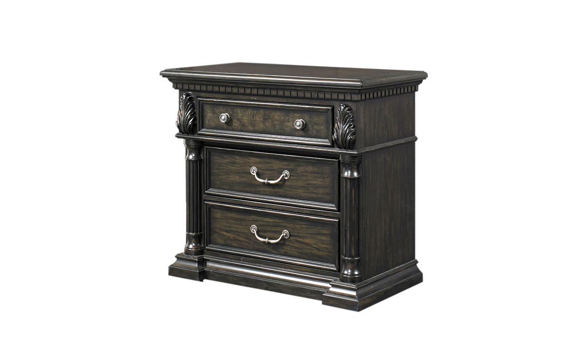 Well-appointed three-drawer nightstand features built-in USB charging port and wireless charging with intricate ornamental carvings in a dark coffee finish.