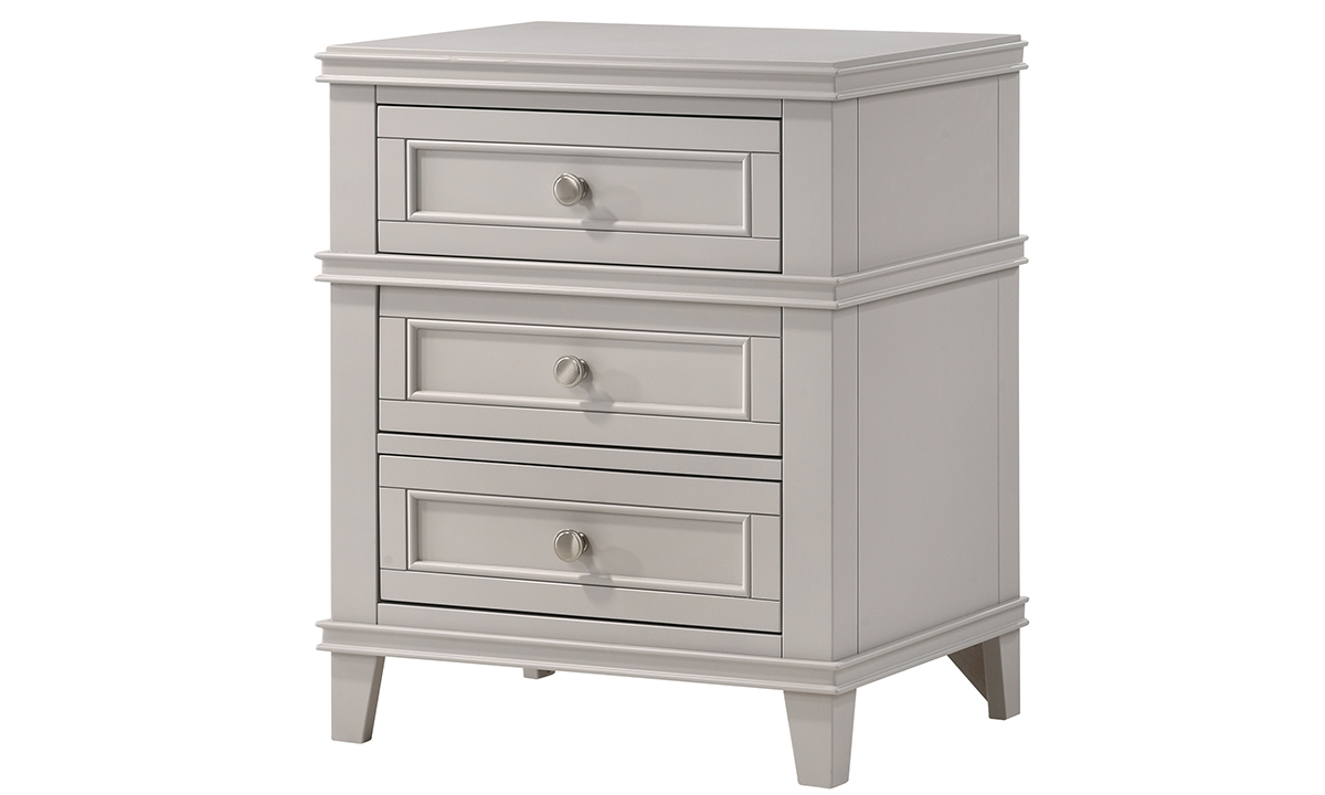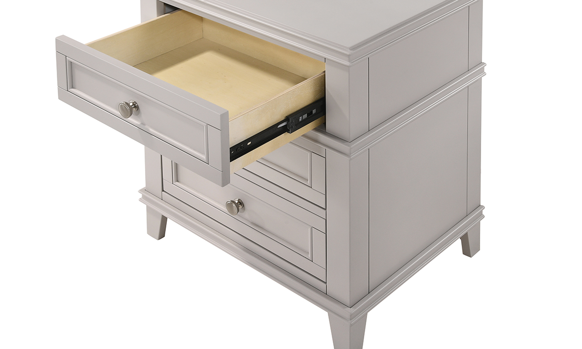 Featuring a soft gray finish, the Waterpointe Gray Nightstand effortlessly blends with any decor style. The clean lines and minimalist design create a sleek and contemporary look, adding a touch of sophistication to your bedroom. The nightstand offers three spacious drawers, providing ample storage space for your nighttime essentials. From books and magazines to personal items and accessories, you can keep everything organized and within reach. The smooth ball bearing drawer guides ensure effortless opening and closing of the drawers. One of the standout features of this nightstand is the built-in USB charging port. With this convenient feature, you can easily charge your devices overnight, keeping them within reach while you sleep. No more searching for outlets or dealing with messy cords—simply plug in your phone, tablet, or other devices and wake up to fully charged batteries. Crafted with poplar solids and birch veneers, the Waterpointe Gray Nightstand offers both durability and quality. The use of high-quality materials ensures that this nightstand will withstand everyday use and last for years to come.