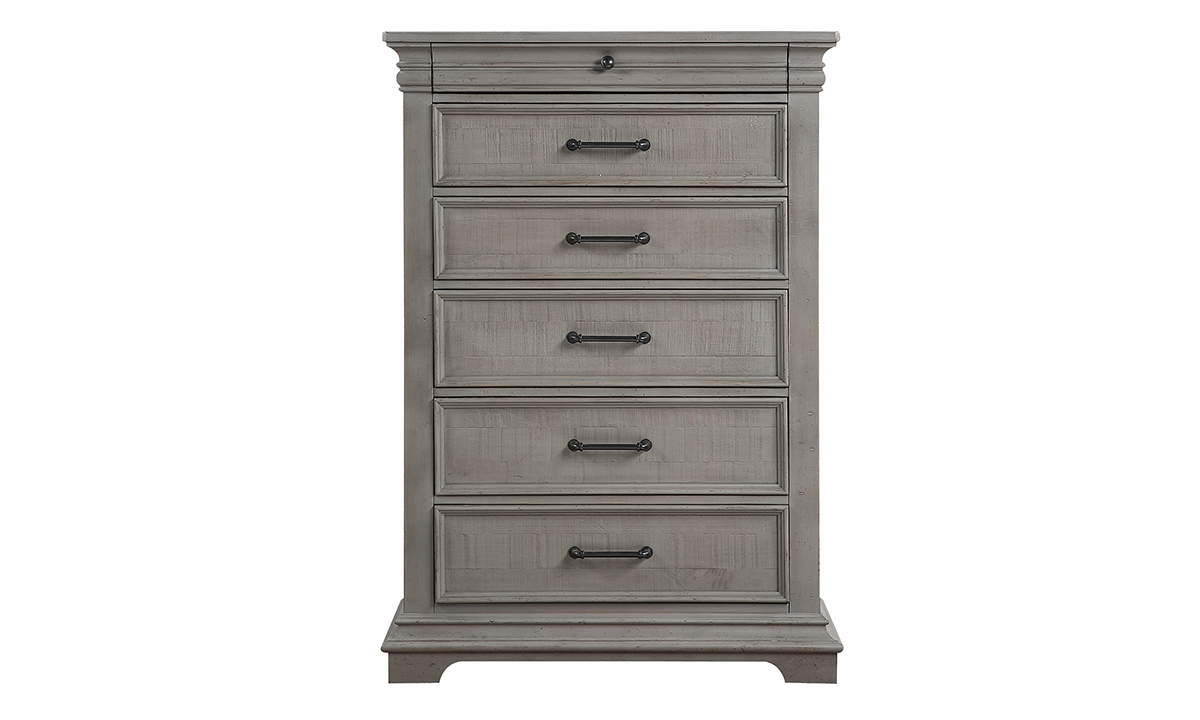 Distressed wood finishes, transitional style and premium materials add lasting value and stylish ambience to this gray 6-drawer chest.