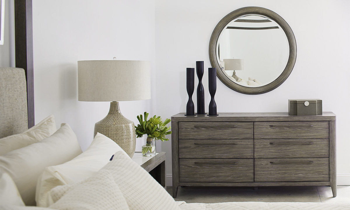 The Drew & Jonathan Griffith Smoked Oyster Mirror is a stunning addition to any king bedroom set. With a Smoked Oyster finish, Split Heart Oak veneers, and rubberwood solids, this round, modern mirror for bedroom features a beveled edge, adding elegance and style to your space.