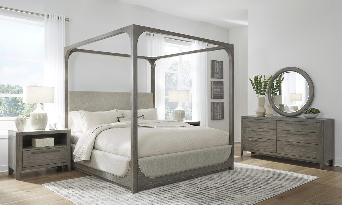 The Drew & Jonathan Griffith Smoked Oyster Queen Canopy Bed is a luxurious centerpiece in queen bedroom sets. With a Smoked Oyster finish, Split Heart Oak veneers, and aged pewter hardware, this elegant bed combines style and comfort, making you feel like royalty every night.