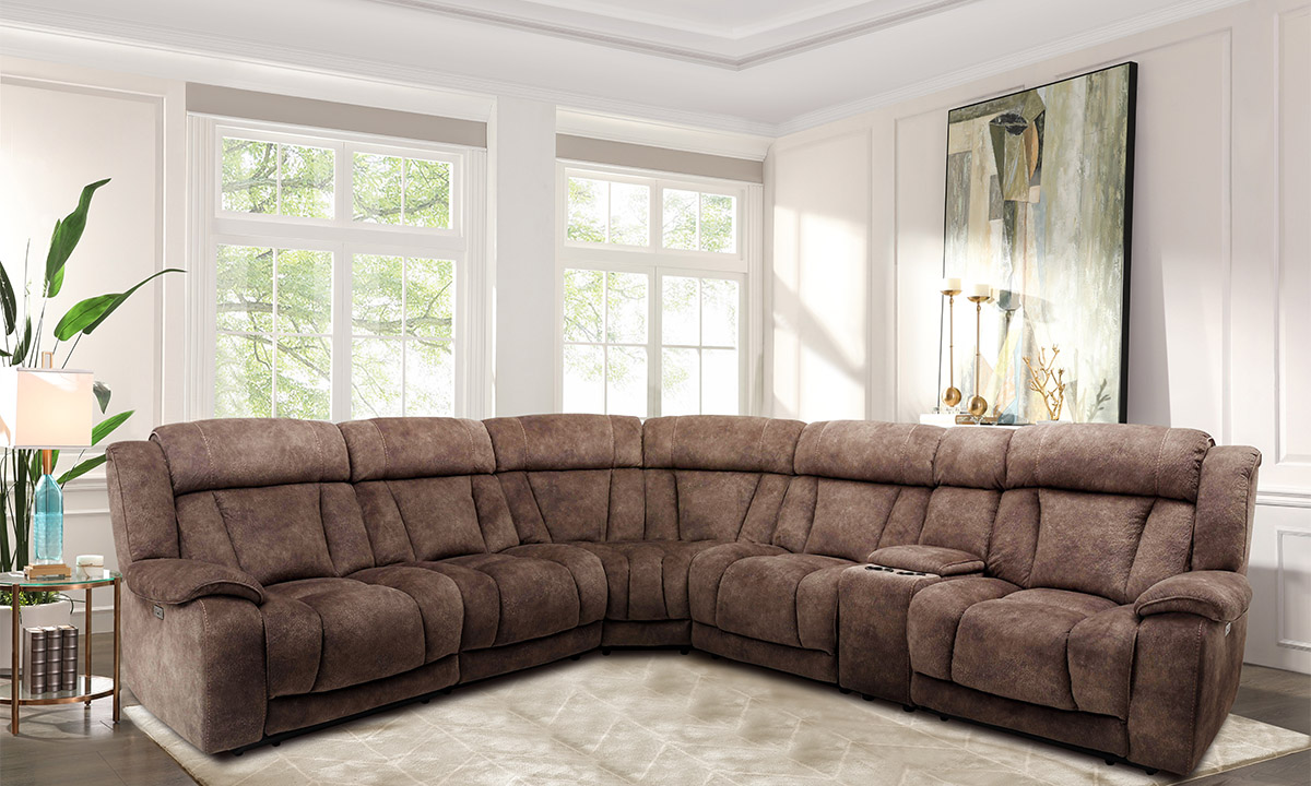 Upgrade your home with modern living room chairs like the Titus Hudson 6-Piece Power Sectional. Upholstered in luxurious Hudson Brown polyester, this sectional includes 2 power reclining pieces that offer customizable relaxation at your fingertips.