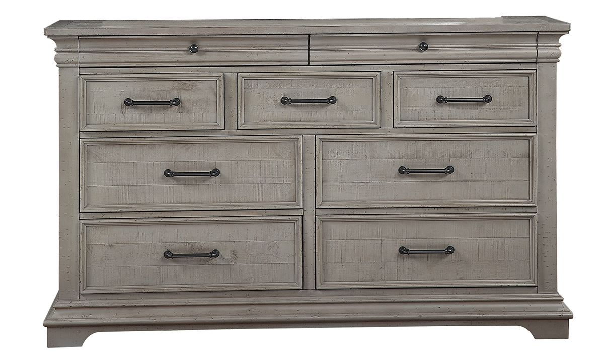 Distressed wood finishes, transitional style and premium materials create a stylish oasis and add lasting value to this 9-drawer dresser featured in pine solid and pine veneer with a weathered gray finish.