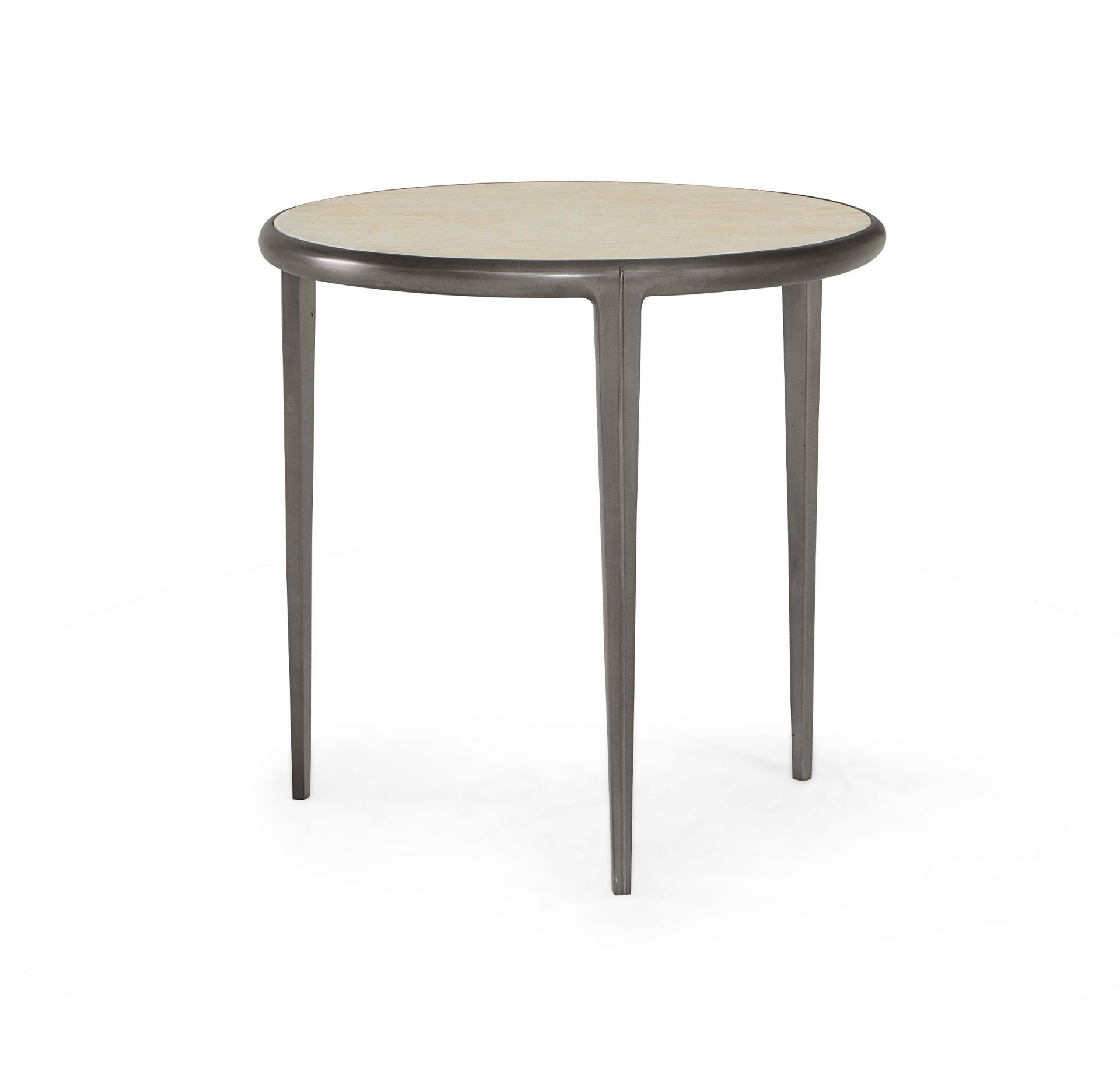 The Aria Pewter Side Table with Onyx Top by Mitchell Gold + Bob Williams features a sleek and refined white onyx top on an elegant tripod design in Pewter. The open and delicate look is perfect for smaller spaces, offering both storage and display options for plants and decor. Elevate your space with this stylish and functional side table.