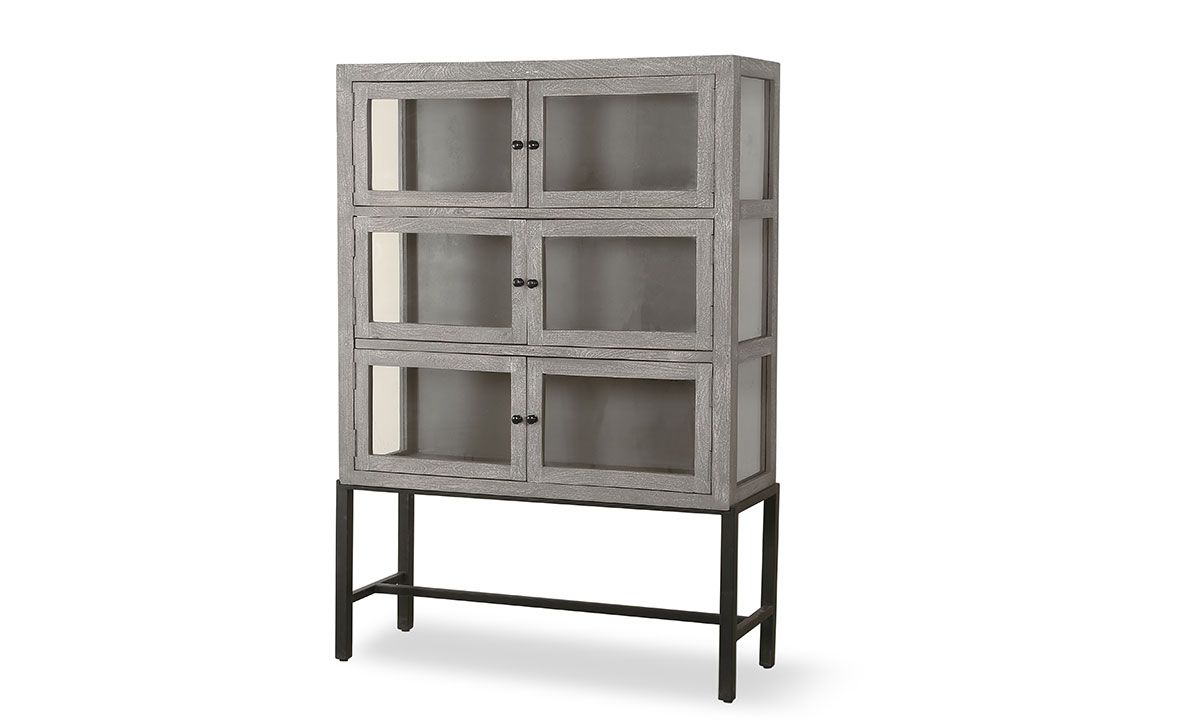 The Godaveri, a coastal contemporary and warehouse mix, was made to showcase your top treasures and antique store finds. Made by skilled artisans, the roomy solid mango wood and glass door combo with black iron legs, was sandblasted with a grey wash finish to give it that reclaimed, repurposed and unique wood feel.