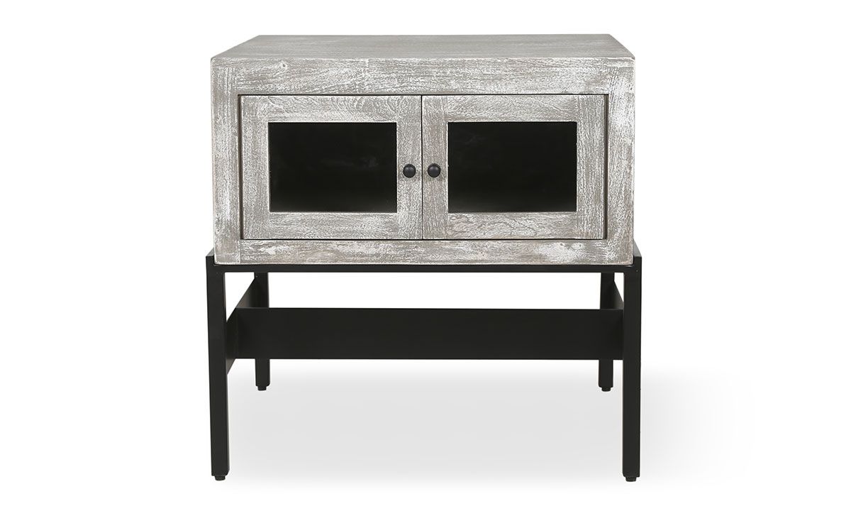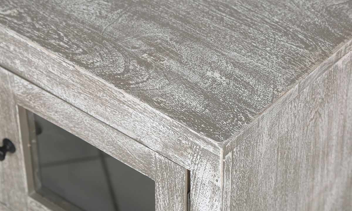 Eye catching and space-saving, this mini end table with clean lines, glass door and reclaimed grey wash finish makes a big statement. Handcrafted by skilled artisans whose work with solid mango wood produces variations that add to the interest and longevity wood is known for.