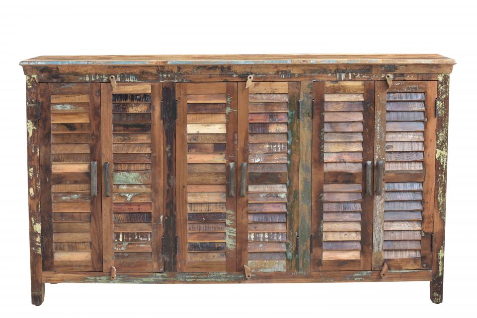 Accentuate your dining room with the rustic charm of the Babul sideboard from the Lotus Collection. Repurposed teak and other solid woods were hand-selected by a single craftsman in India to create this piece. Louvered cabinet doors couple with unique variations of weathered cream and blue colorings for a coastal touch, topped with hammered iron handles.