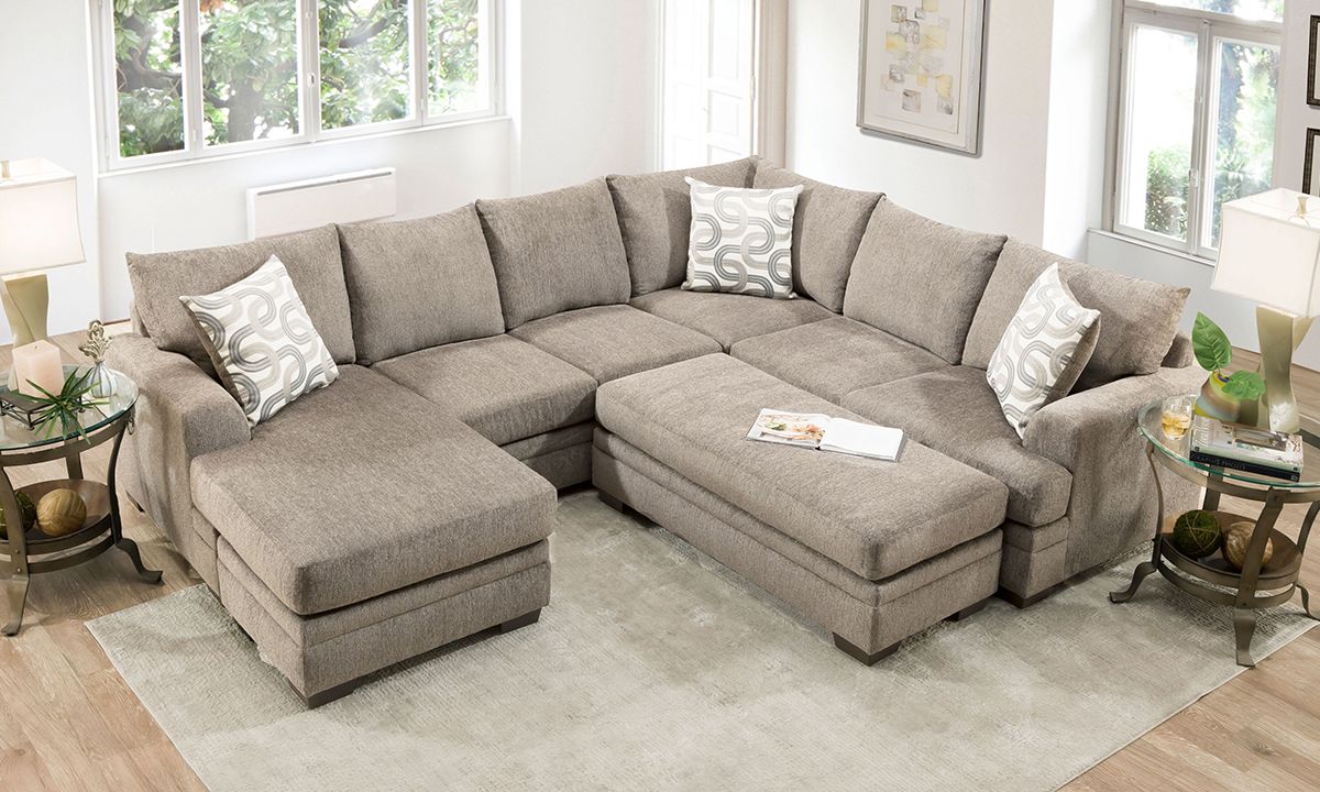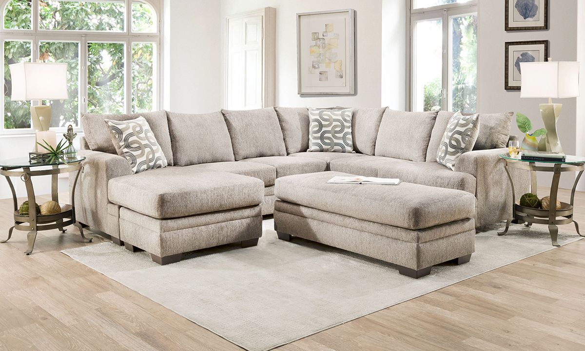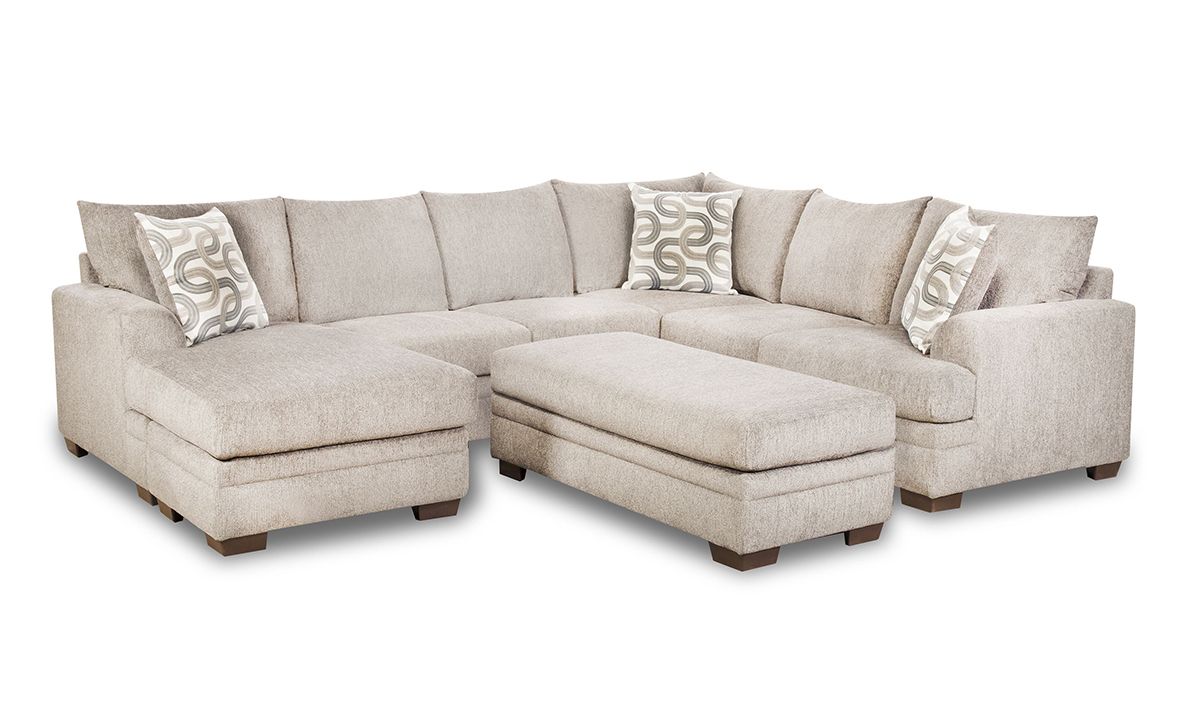 Create a comfortable, inviting gathering space anchored in versatile, transitional style with the Croft Sand Reversible Chaise Sectional. American-made for lasting durability, the right facing sofa, left facing loveseat and reversible chaise that make up this substantial sectional start with a hardwood frame housing the sinuous spring support system which are then wrapped in plush, high-density foam cushions. Relaxed, sand-colored fabric upholstery lends a chic, versatile touch to the transitional design, distinguished by the uniquely sloped armrests adding to the cozy, sheltered feel. Included with the sectional, the three reversible throw pillows add a fun pop of pattern while complementing the neutral color scheme. The inviting chaise is composed of a free-floating ottoman and one-piece chaise cushion so the configuration can be reversed to have a chaise on either the left or the right side, perfect for easy rearranging and refreshing.