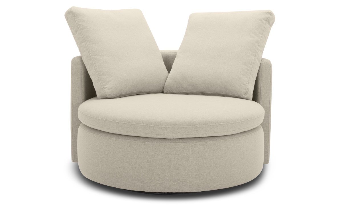 Modern 45-inch round swivel chair balances a playful, contemporary silhouette with classic linen-hued fabric upholstery and includes two matching throw pillows.