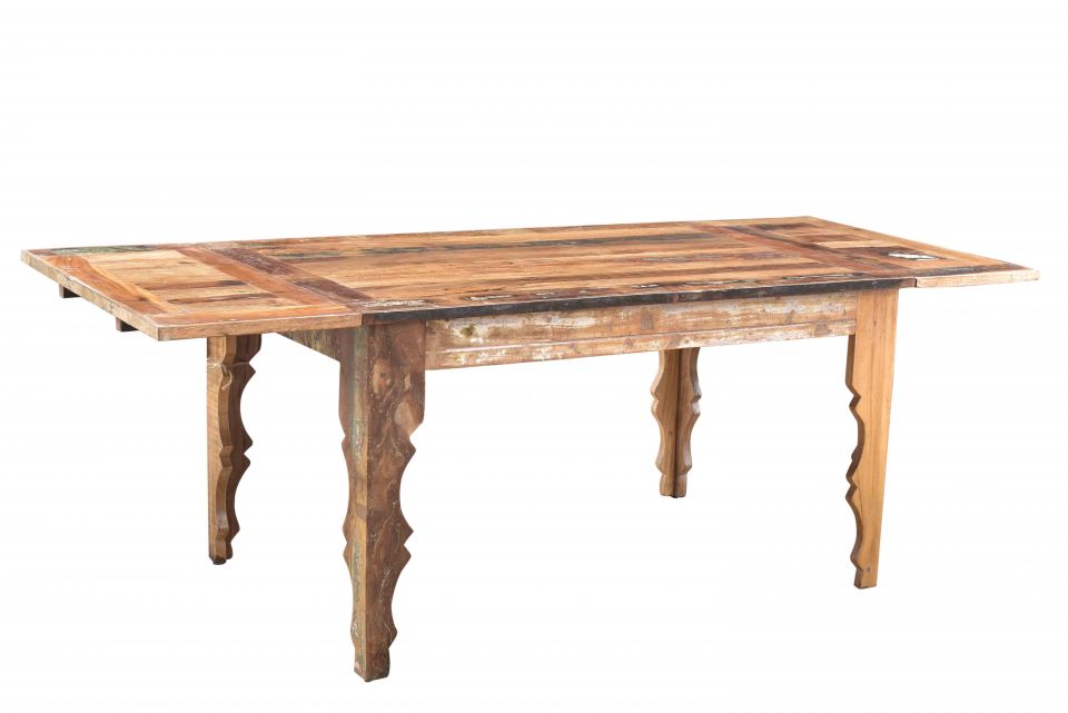 The Lotus Collection brings historic Indian architecture back to life with the Bali dining table. This 55-inch piece is crafted in India by a single skilled artisan using recycled teak and other reclaimed solid woods. Two removable leaves increase the surface space to 87 inches, showcasing the wood’s unique weathering and distressing above sculptural legs.