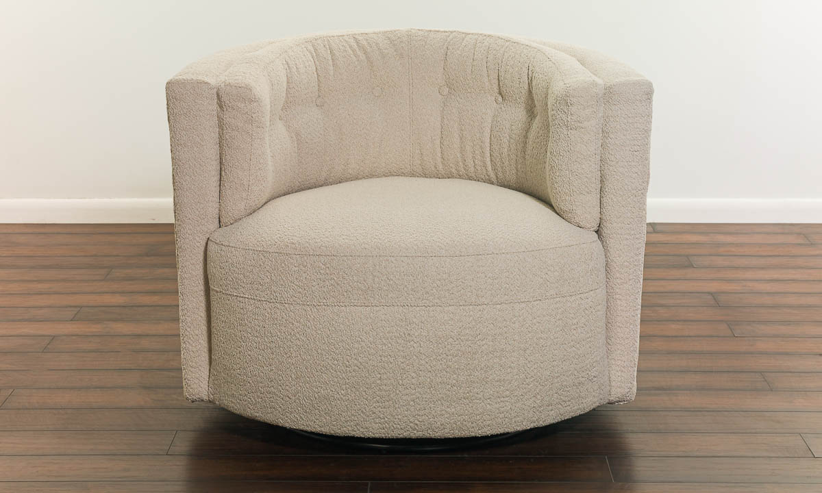 Versatile accent swivel chair features a sleek and classic profile and sturdy base in a light merit pearl hue.