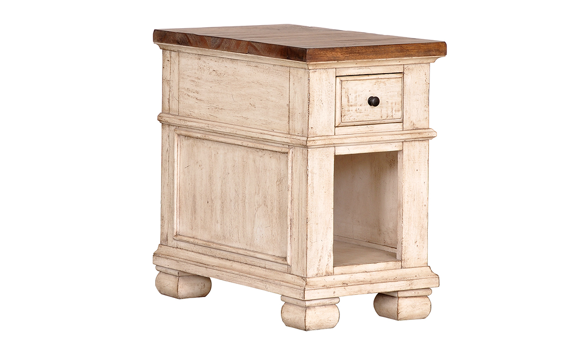 A welcome companion piece to your living room ensemble, the Belmont Antique Linen 1-Drawer Chairside Table lends time-worn character and timeless charm to any space. Crafted to resemble beloved antiques, this sturdy 26-inch tall chairside table is made from resilient Sengon Tekik hardwoods and features classic design elements like carved crown molding and louvered paneling. Lending a lived-in, farmhouse-inspired charm to the piece, the two-tone Antique Linen and Farmhouse Brown finish is heavily distressed to give it an authentic, aged look. A convenient upper storage drawer makes the perfect hideaway for remotes and other entertainment essentials while books and other items can be tucked neatly away in the lower open storage cubby.
