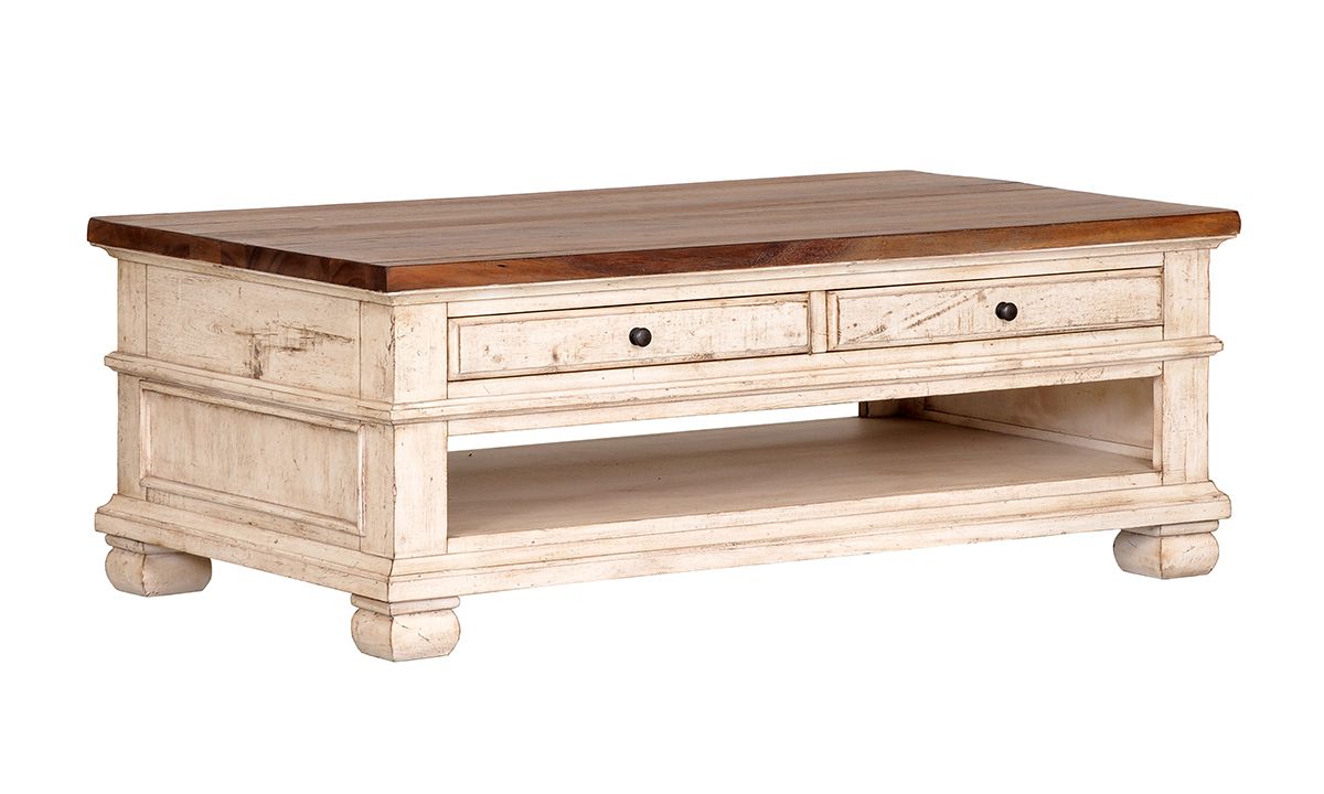 Introduce instant character and relaxed, time-worn style to your living room with the Belmont Antique Linen Cocktail Table. Crafted from exotic Sengon Tekik hardwoods for lasting durability, this 40-inch wide rectangular cocktail table flaunts a traditional farmhouse-inspired silhouette distinguished by deeply carved crown moldings and a wood plank surface. Lending a casual, inviting feel to the classic design, the two-tone Antique Linen and Farmhouse Brown finish is heavily distressed for an authentic, lived-in look. A large open shelf at the bottom makes an ideal spot for coffee table books while the two spacious storage drawers above keep remotes and other essentials neatly tucked away.