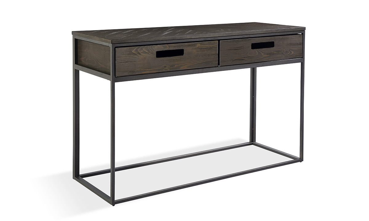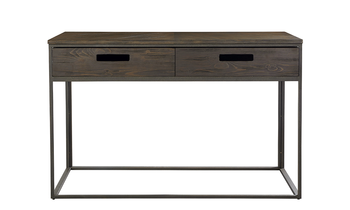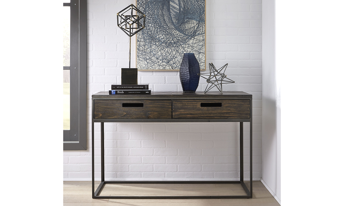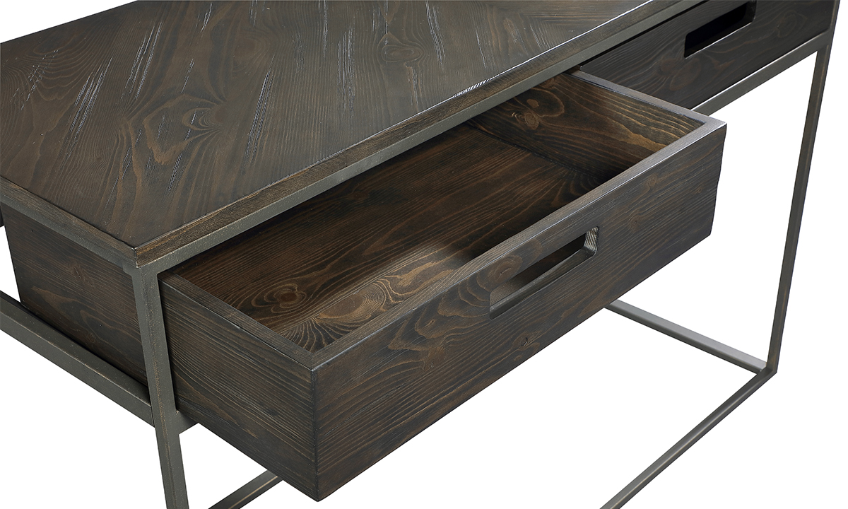 Wood surfaces are wire brushed to simulate the raised grain and patina of naturally weathered wood
