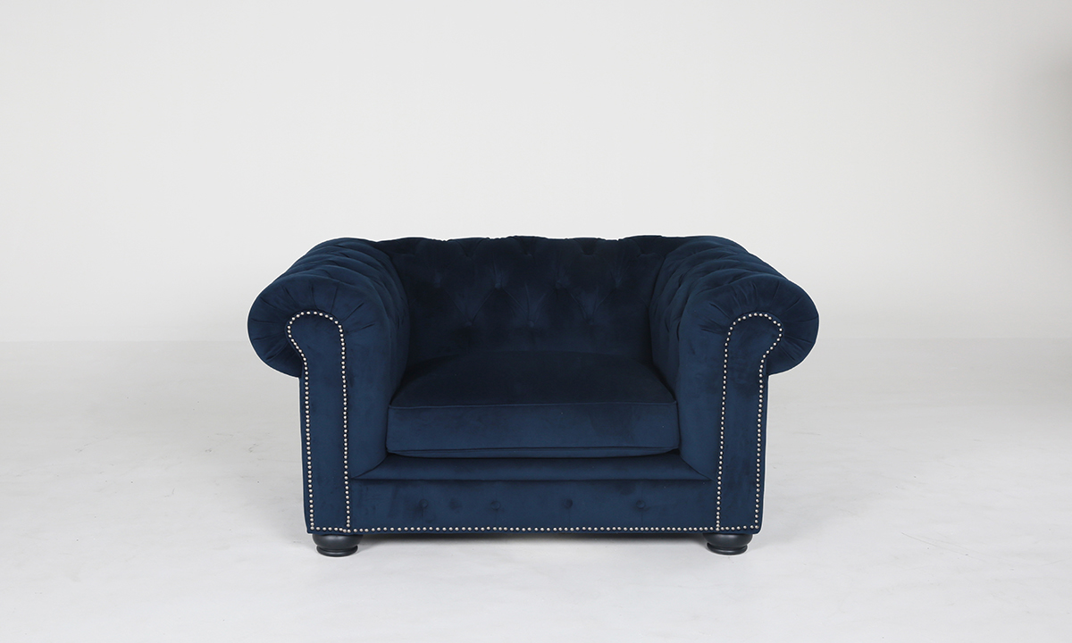 Make room for on-trend and underpriced with the factory direct Midnight Velvet blue Chesterfield style two-piece living room set. The sofa and armchair are upholstered in midnight velvet polyester blend fabric, and detailed with a roll arm design, nail head trim and rubber wood legs.