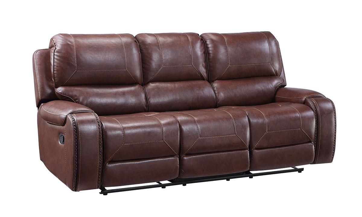 Upgrade your living room relaxation levels with the superior comfort and unforgettable style of the Caspian Brown 3-Piece Reclining Living Room Set. A perfect balance of form and function, the sofa, loveseat and rocker recliner included in the set all feature warm brown leather-look fabric upholstery tailored in unique baseball stitch accents and antiqued brass nail head trim. Loaded with features, the double reclining sofa boasts a central drop-down table which includes two cupholders, a wood grain table surface, storage pouch and pop-up power station with two power outlets and two USB charging ports. Not to be upstaged, the matching loveseat also features a central storage console with two cupholders, a power outlet and two USB charging ports while the manual recliner grants total freedom of movement thanks to the relaxing rocker mechanism and 360° swivel motion.