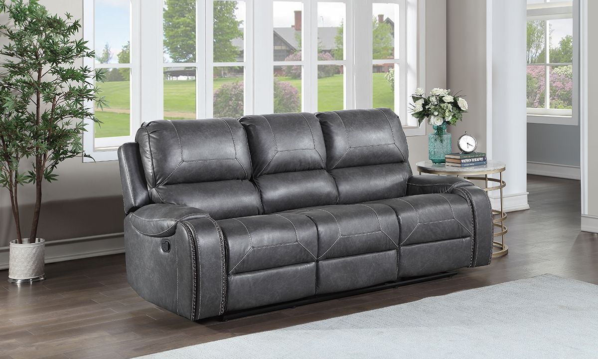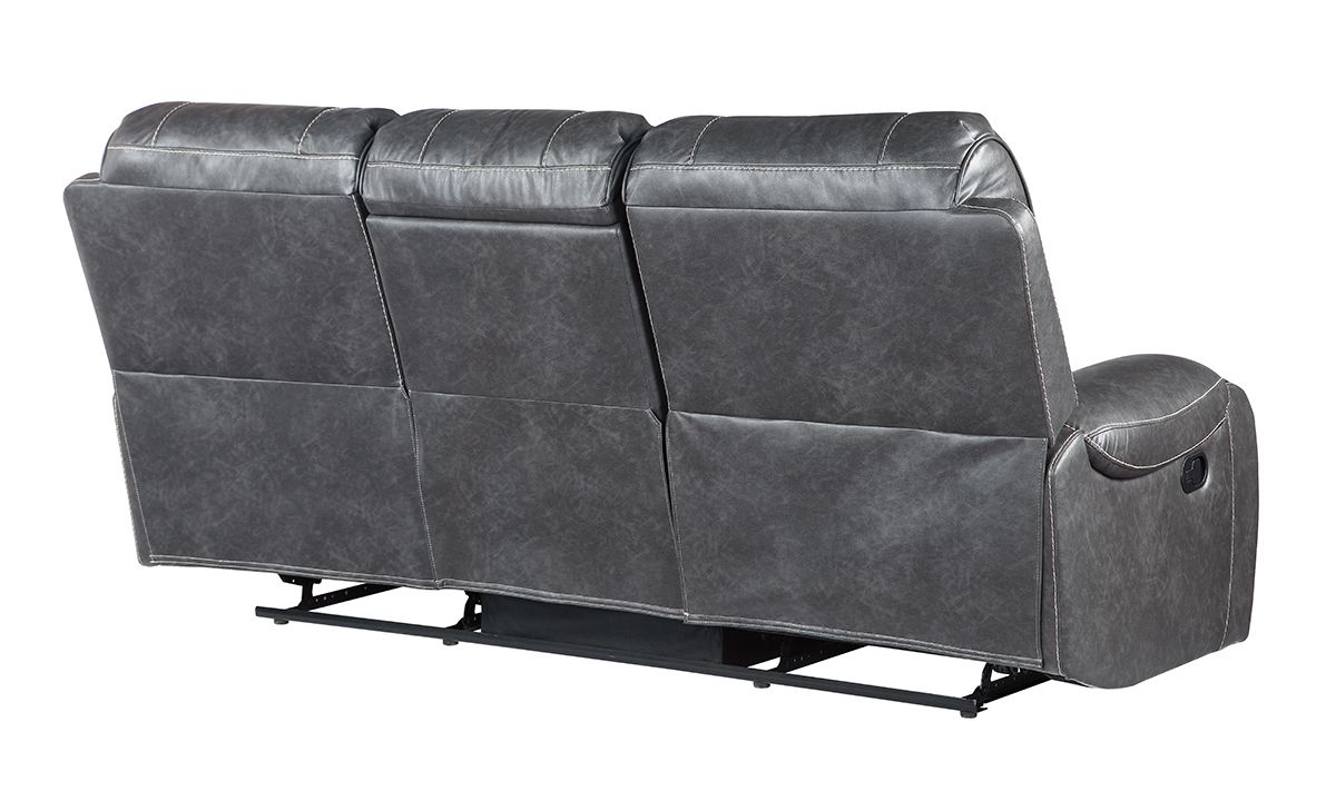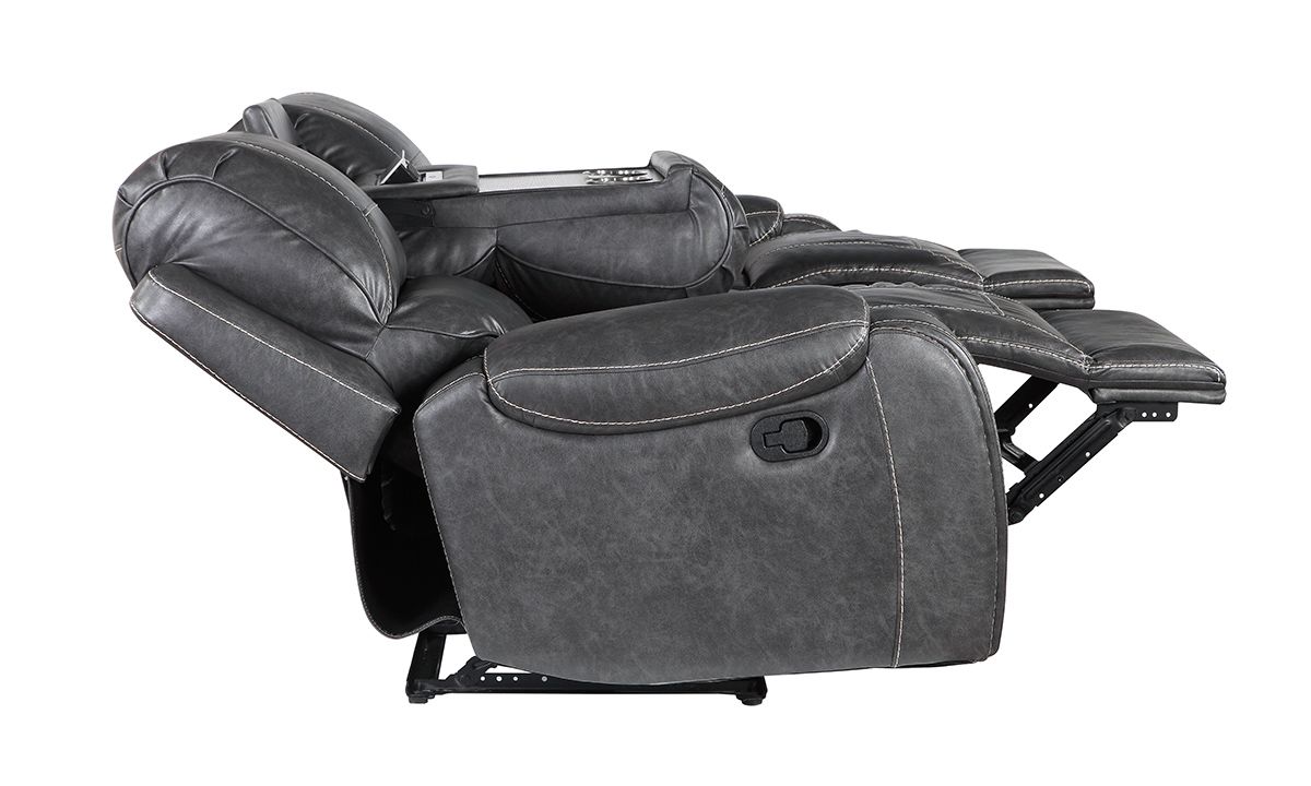 Upgrade your living room relaxation levels with the superior comfort and unforgettable style of the Caspian Grey Reclining Sofa with Drop Down Table. A perfect balance of form and function, this spacious 86-inch wide sofa features smooth grey leather-look fabric upholstery tailored in unique baseball stitch accents and pewter nail head trim. A central drop-down table in between the two manual recliners includes two cupholders, a wood grain table surface, storage pouch and pop-up power station with two power outlets and two USB charging ports for the ultimate entertainment station.