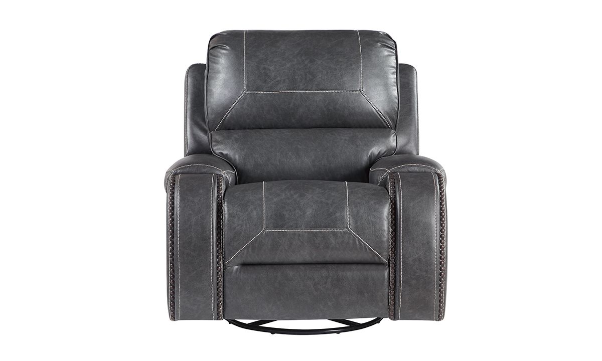 Swivel, rock or recline in style with the loaded features and sleek design of the Caspian Grey Swivel Rocker Recliner. A perfect balance of form and function, this spacious 42-inch wide manual recliner features smooth grey leather-look fabric upholstery tailored in unique baseball stitch accents and pewter nail head trim. Enjoy the smooth rocking motion or 360° swivel spin with a gentle push or use the easy pull hand release-lever located on the outer right arm to ease into a relaxing reclined position.