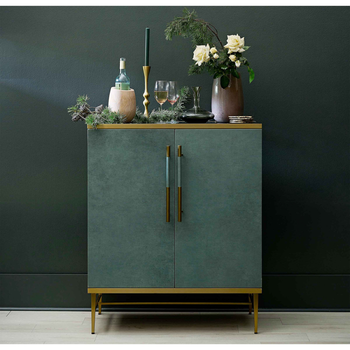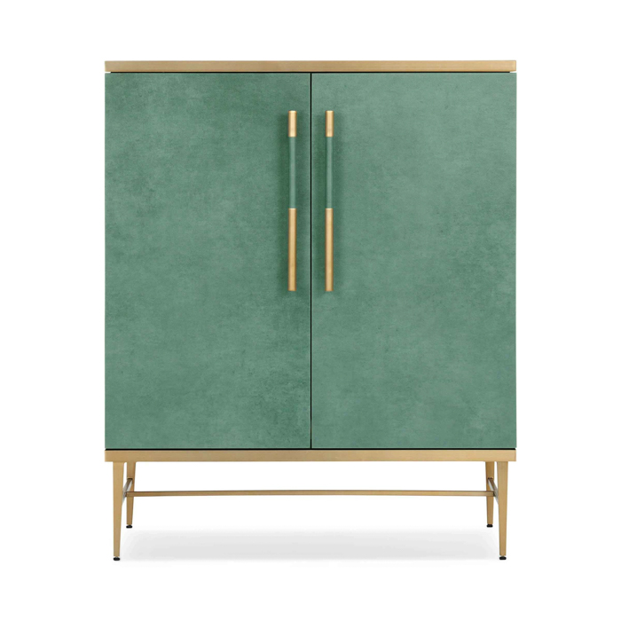 Its chic design, featuring rich verdigris green faux leather and brushed brass details, adds a touch of luxury to your entryway, living room, or dining room. With ample storage, adjustable shelves, and cord management, this cabinet is as practical as it is stylish.