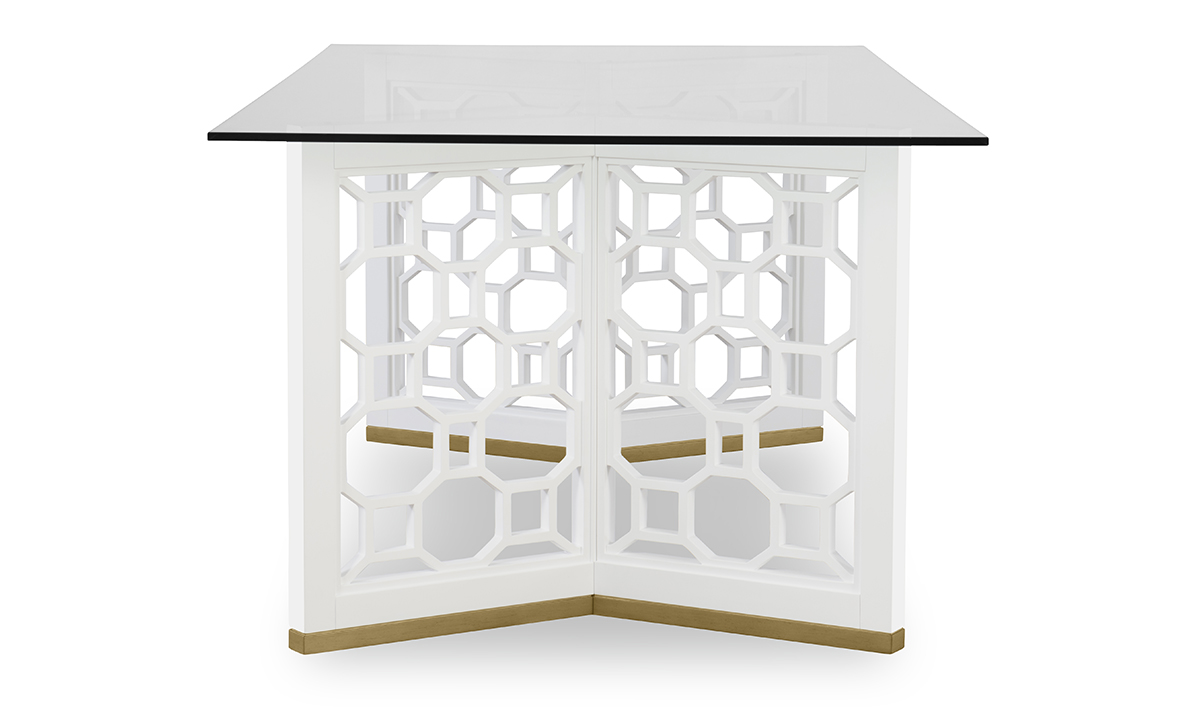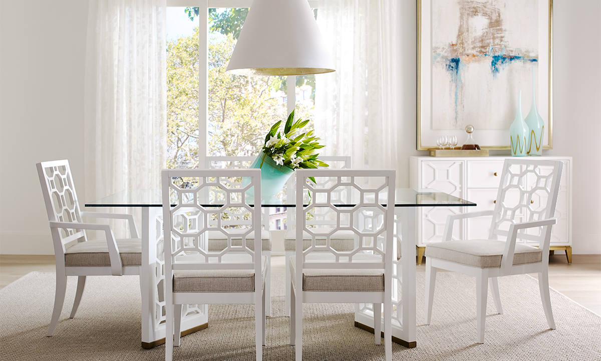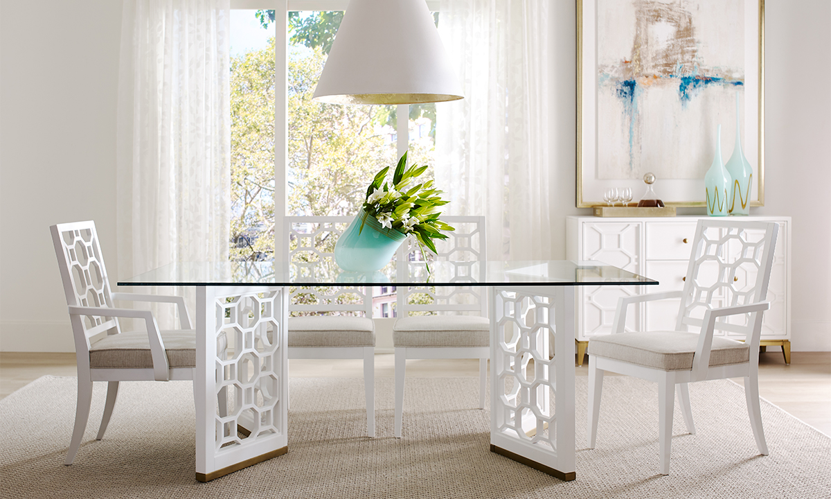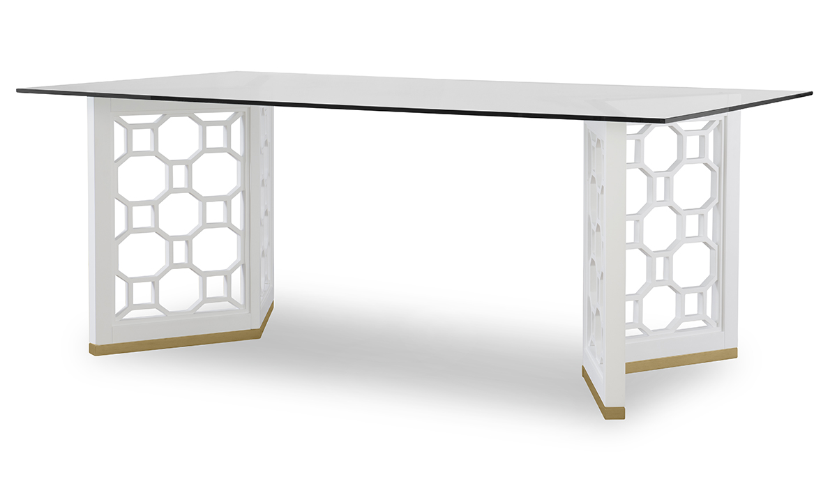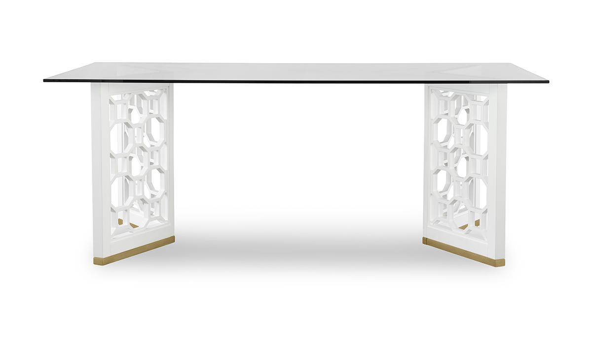 Upgrade your dining room to an elegant space with the Rachael Ray Chelsea White Glass Top Dining Table. With white and gold finish and a glass top, this table will be the centerpiece of your home!