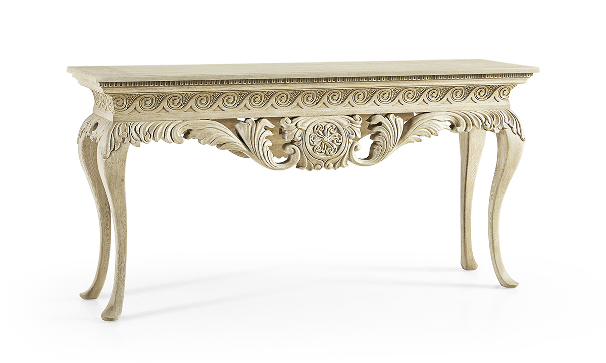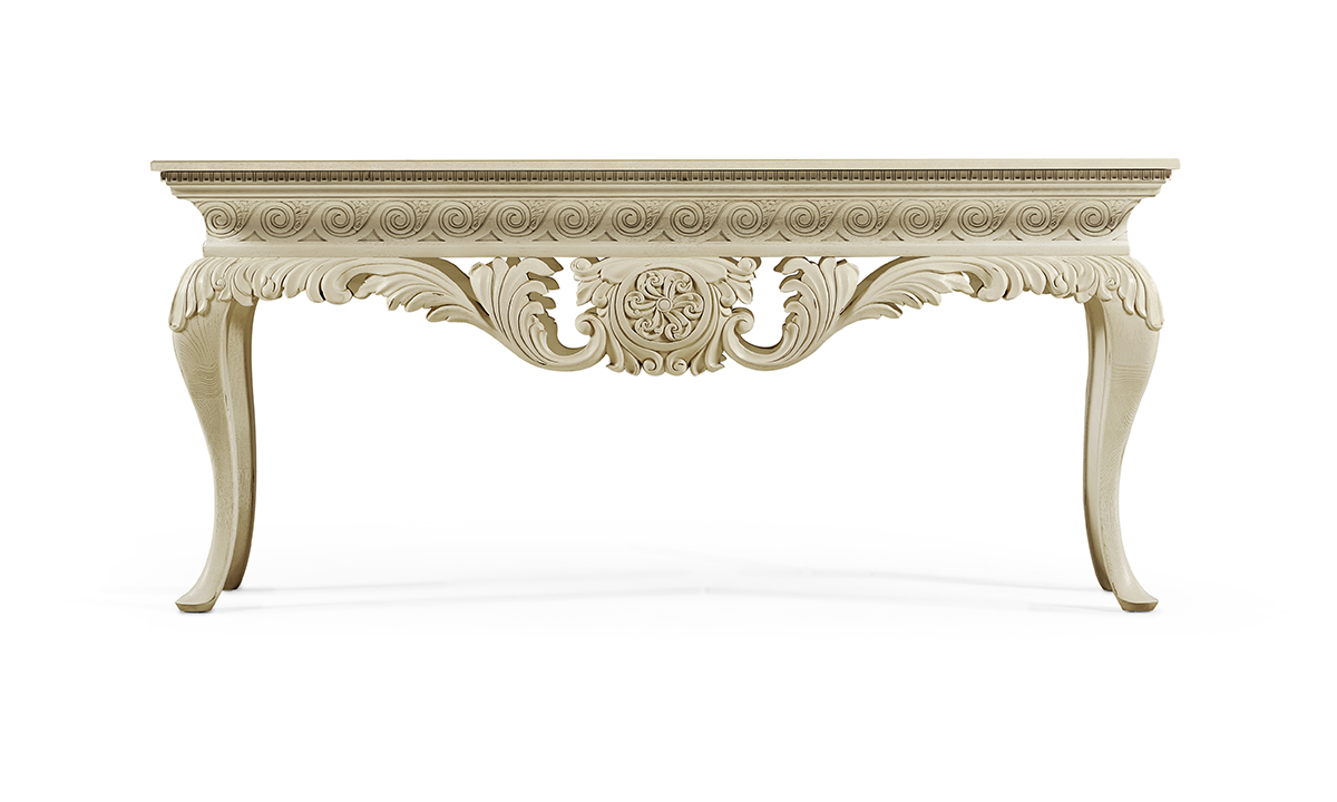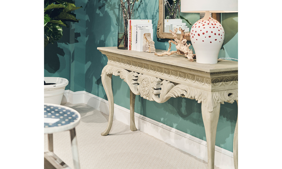 A hand-carved apron adorned with delicate blooms hugs the inlay glass top, through which one can admire the intricate cane inlay design of a bottom shelf