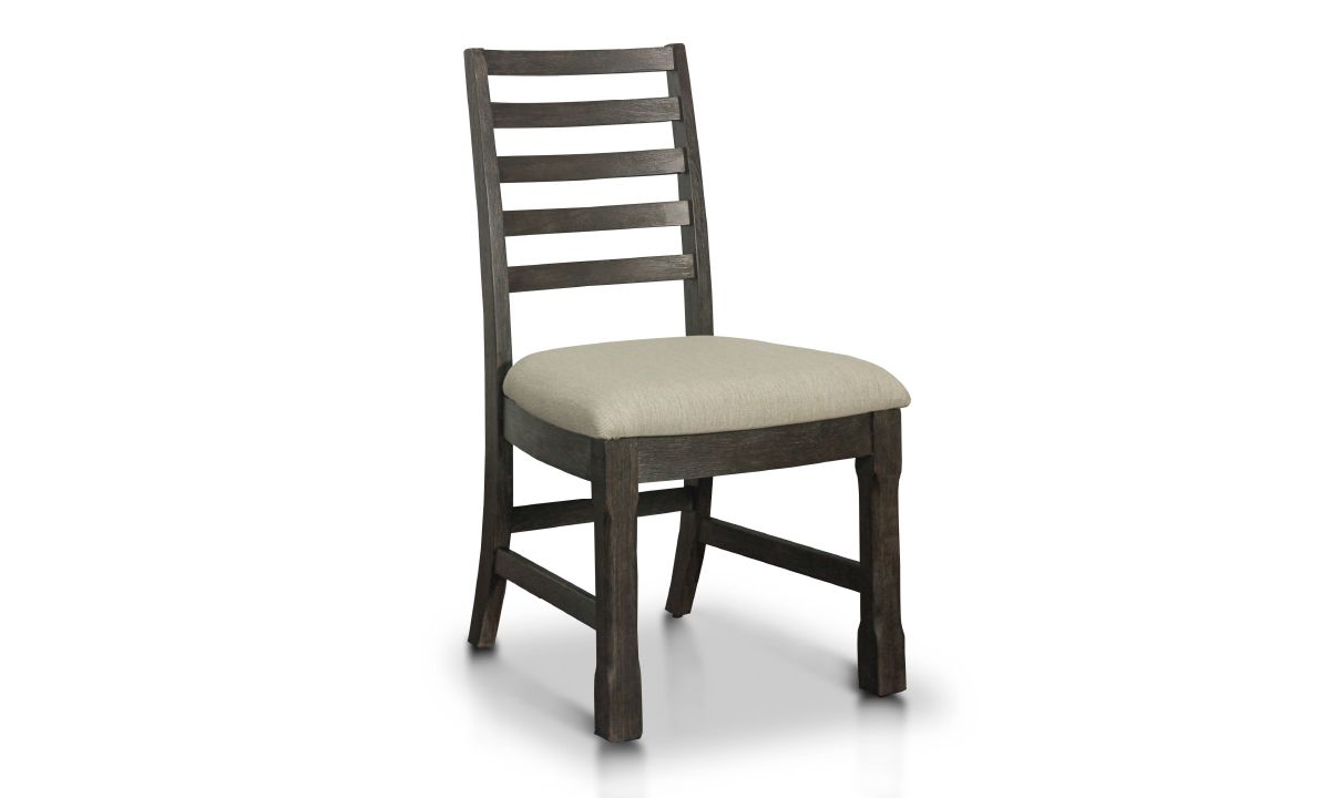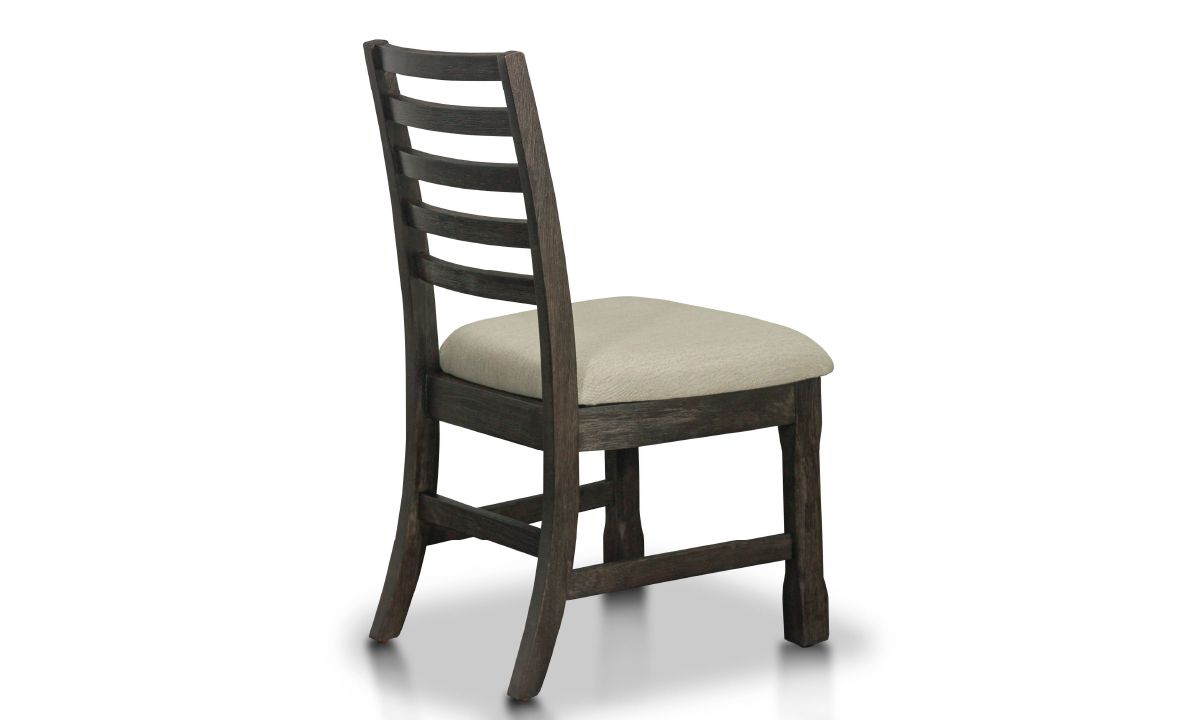 The Coopers Beach Bark Ladderback Side Chair features upholstered seat cushions, Mindi solids and Oak veneers with distressed Bark Brown wire-brushed finish.