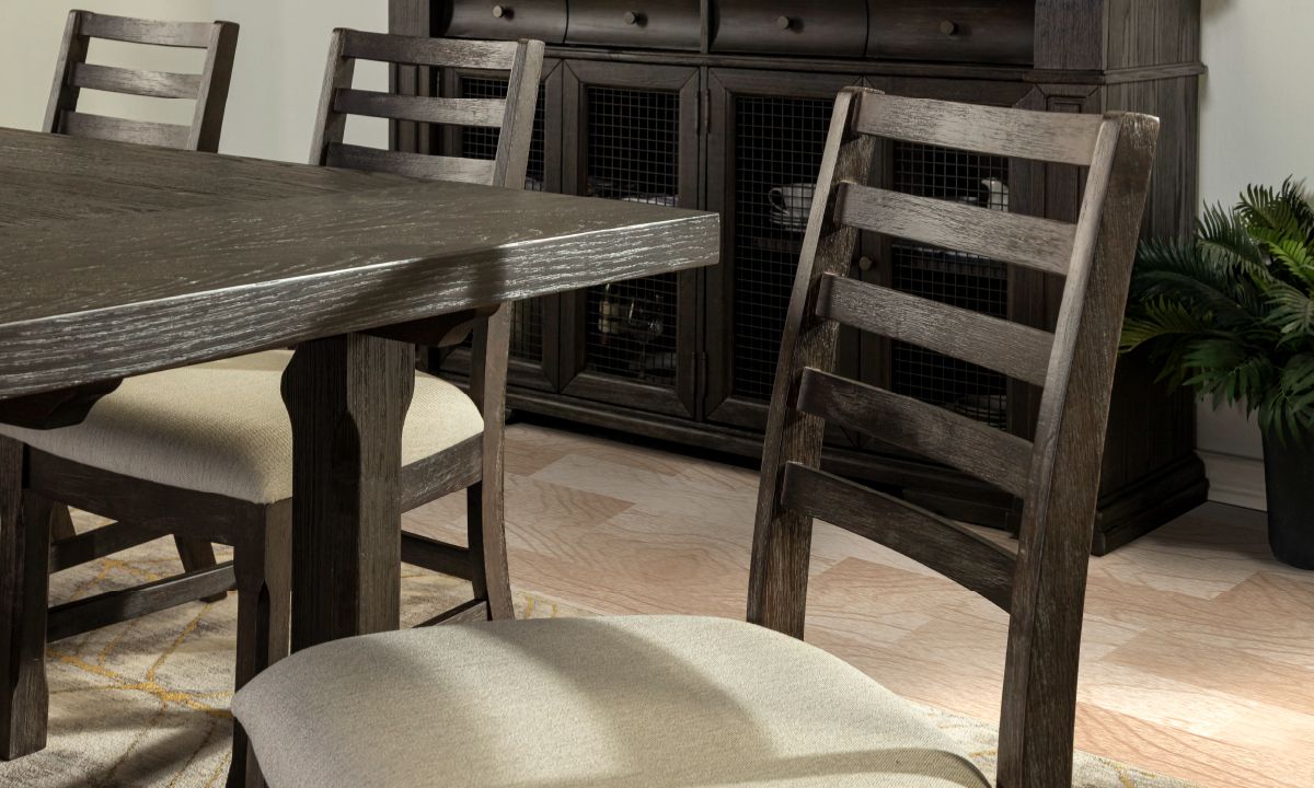 Coopers Beach Bark Ladderback Side Chair is rustic yet refined. Featured in mindi solids and oak veneers with a distressed bark brown wire brushed finish, the handsomely detailed brown chair complements the comfortable neutral toned-upholstered seat cushions.