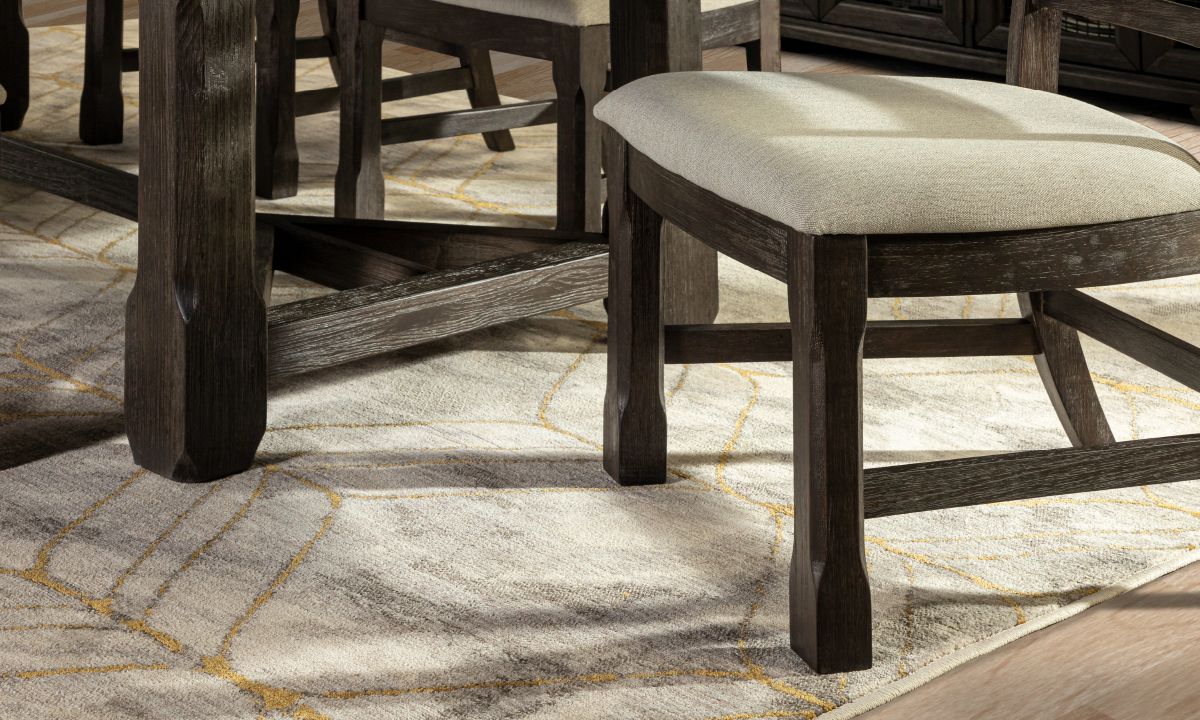 The Coopers Beach Bark Counter Height Table features Mindi solids and Oak veneers with distressed Bark Brown wire-brushed finish and seats up to 8 with two extension leaves.