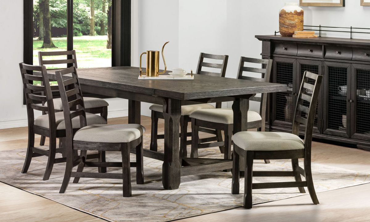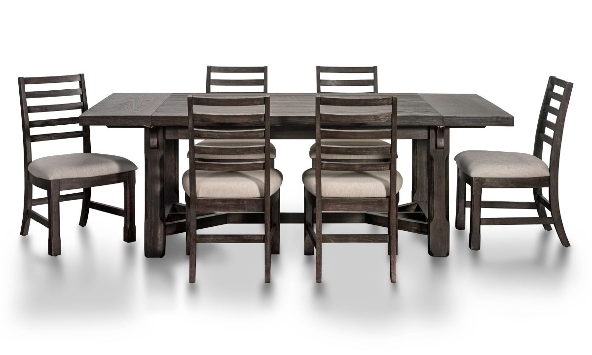 The Coopers Beach Bark Dining Table is made from Mindi solids and Oak veneers with distressed Bark Brown wire-brushed finish. It features two extension leaves and sits up to eight people.