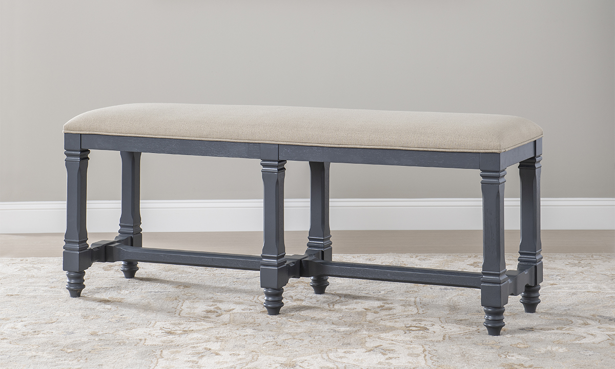 Elevate your dining area with the Essex Khaki and Graphite Counter Height Bench. This upholstered piece, part of our dining benches collection, blends select hardwoods and birch veneers for a refined look.