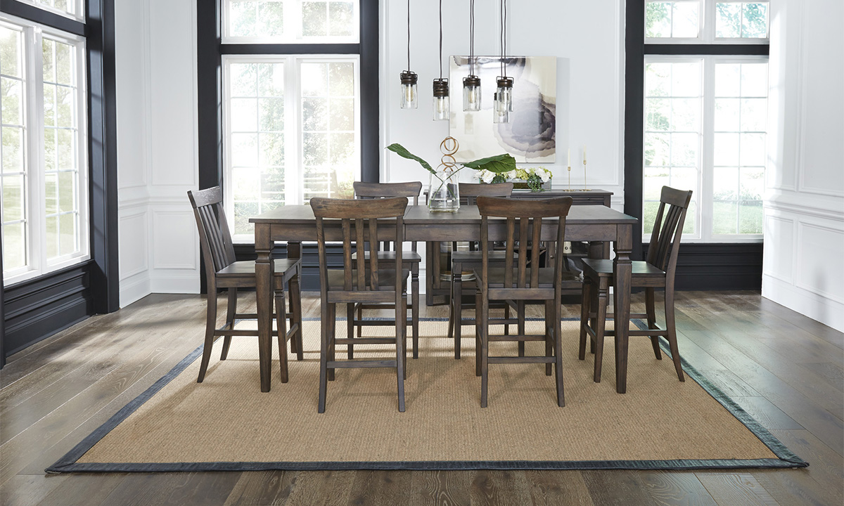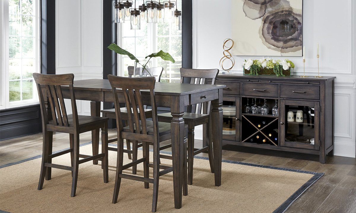 Enhance your experience with the Counter Height Dining Room Table. This table boasts an 18” self-storing butterfly leaf and drawers, solid rubberwood construction, and a dusty black color. Perfect for any dining room!