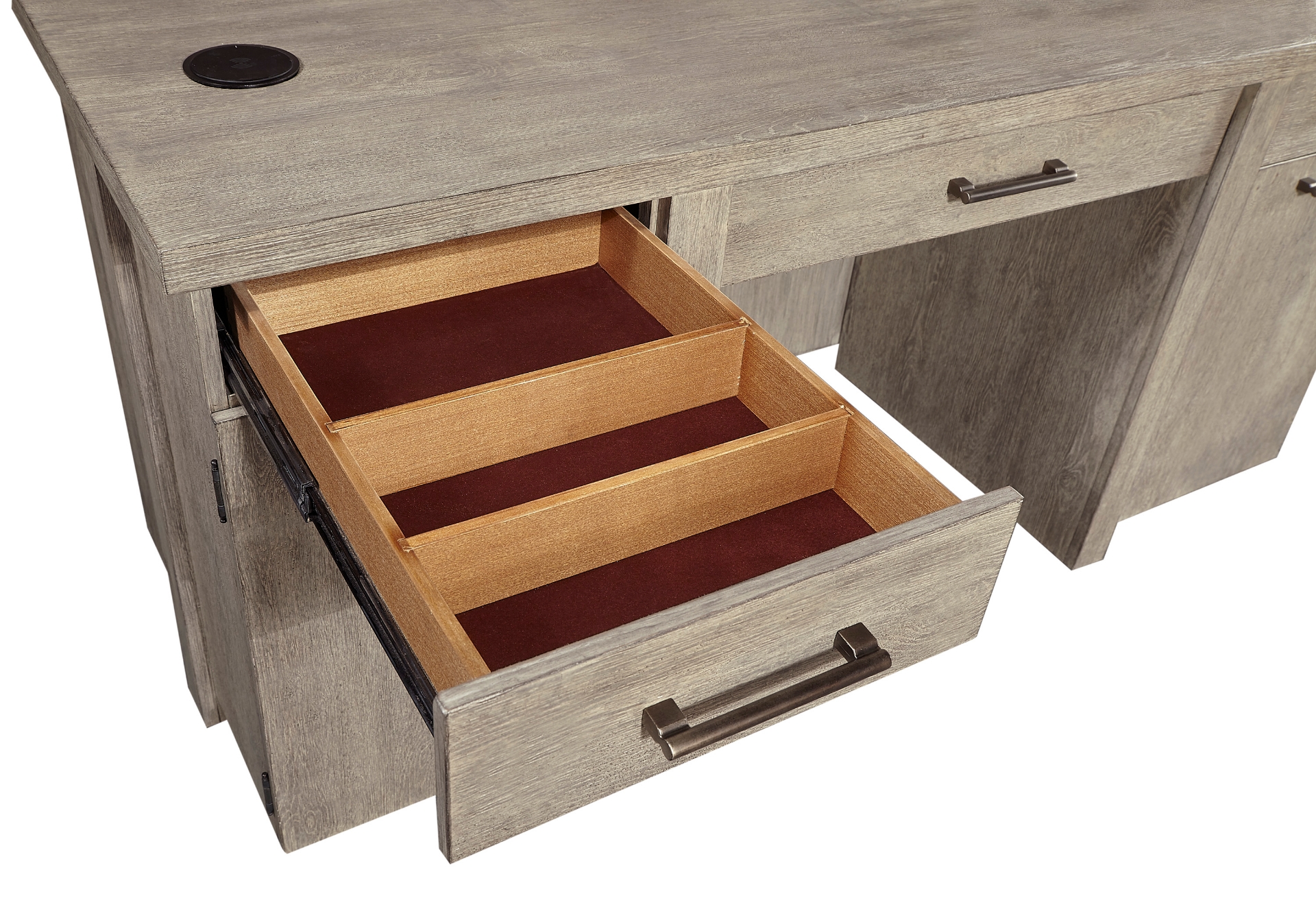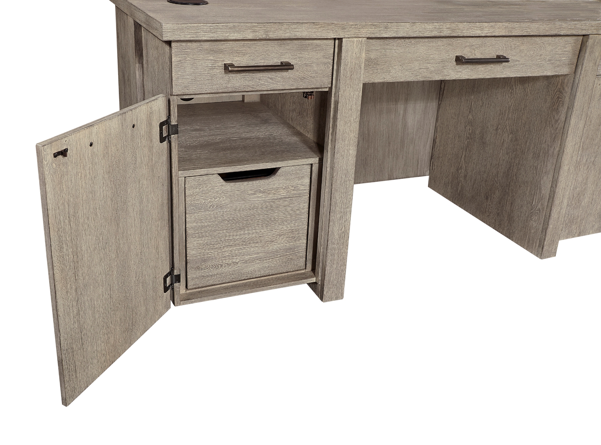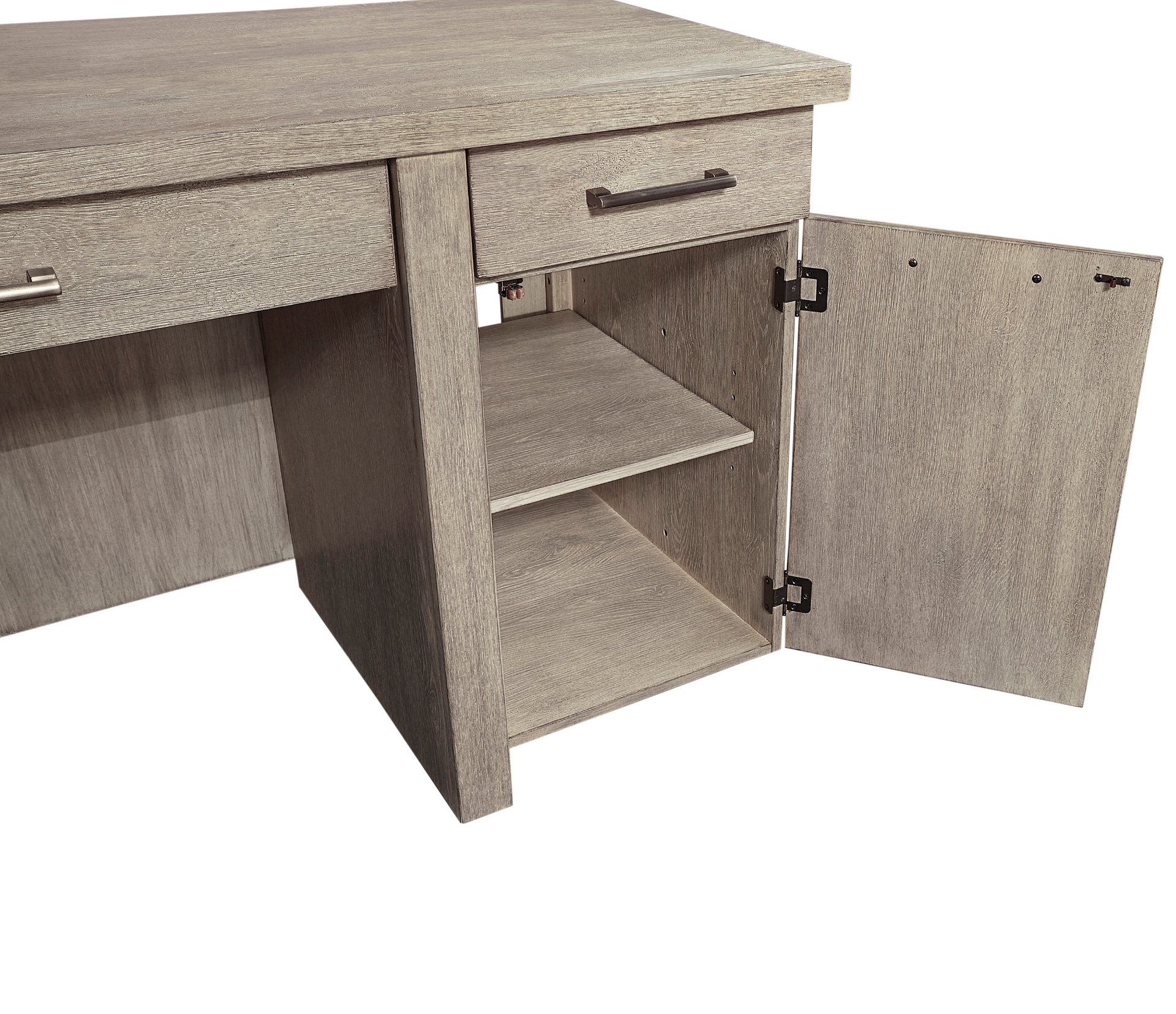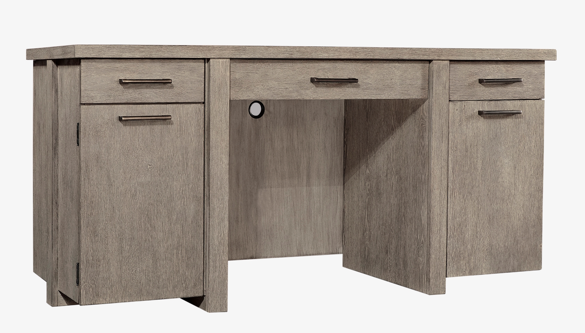 Sleek, urban and priced right, the Platinum gray Linen 66” Executive Desk is featured in select hardwoods and knotty oak veneers with gray linen finish – and dovetail joinery for lasting value.