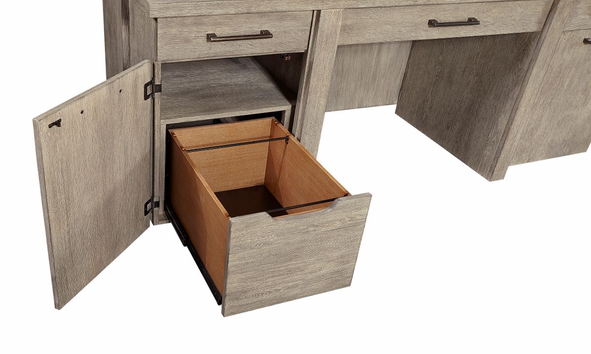 Sleek, urban and priced right, the Platinum gray Linen Workstation and Combo File is featured in select hardwoods and knotty oak veneers with gray linen finish – and dovetail joinery for lasting value.