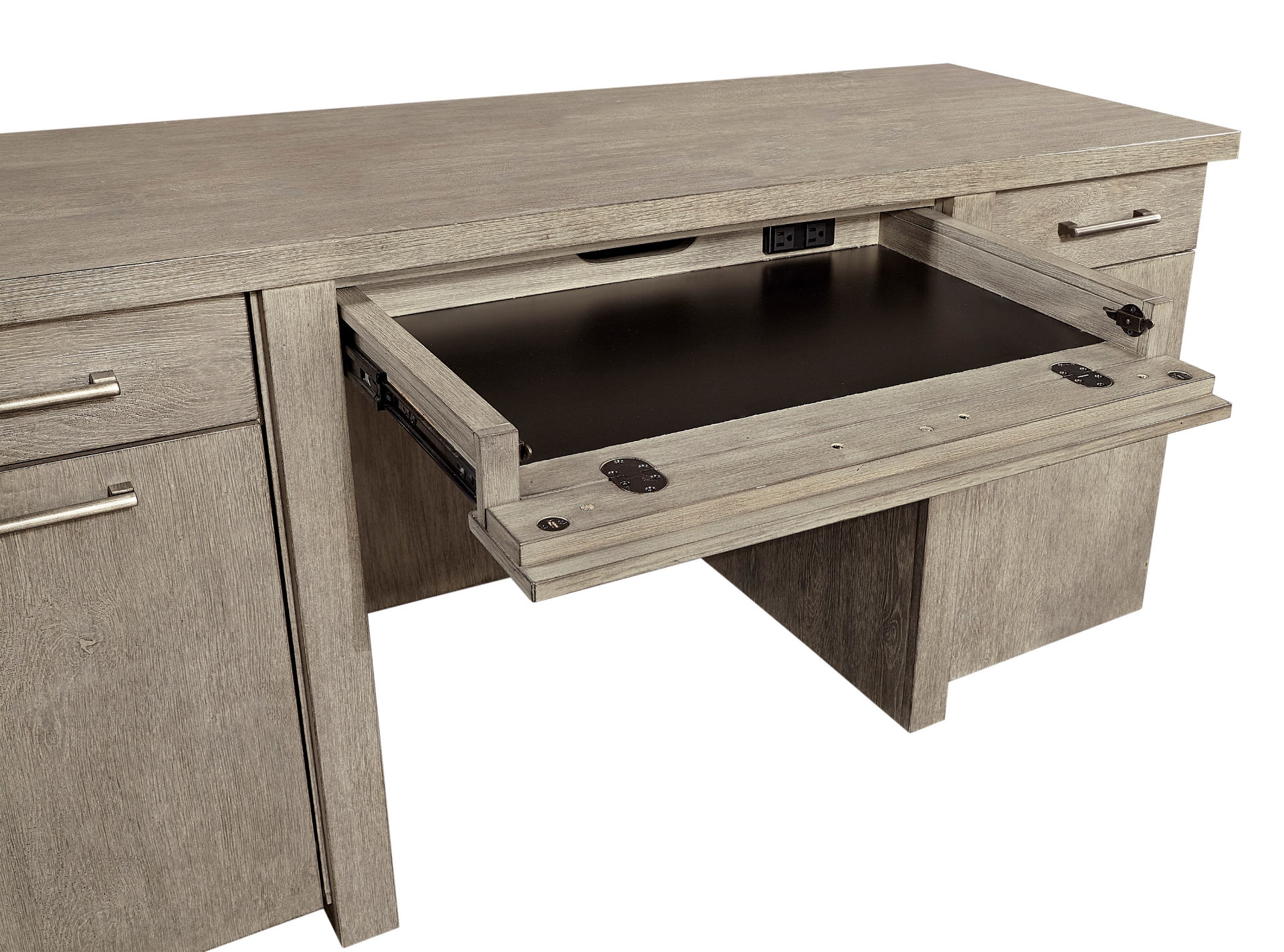 Priced just right, the Aspenhome Linen Credenza is the vision of an urban, contemporary brand focused on high-quality features and exotic finishes to reflect a particular wood’s character and natural beauty. Materials such as select hardwoods and knotty oak veneers with gray linen finish, satin silver hardware Design Features + Construction Upgrades include dovetail joinery and drop-front keyboard drawer and removable dividers Hi-tech, add-ons like large monitor accommodations, cord management, and built-in wireless charging