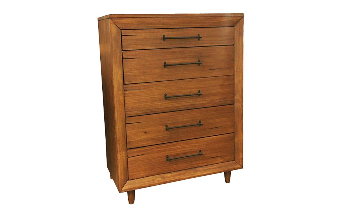 Enjoy solid construction, bold contemporary style and generous storage space with the Rotta Denver Live Edge Solid Pine 5-Drawer Chest.This sturdy and stylish storage piece is meticulously crafted from solid Brazilian Pine, the rugged Brushed Brown finish drawing out the natural variations of the woodgrain while softening the angular, modern shape, tapered wood legs and picture-frame border of the 46-inch tall chest. The five spacious storage drawers are all made with resilient French dovetail construction with a convenient removable felt-lined jewelry tray included in the top drawer.