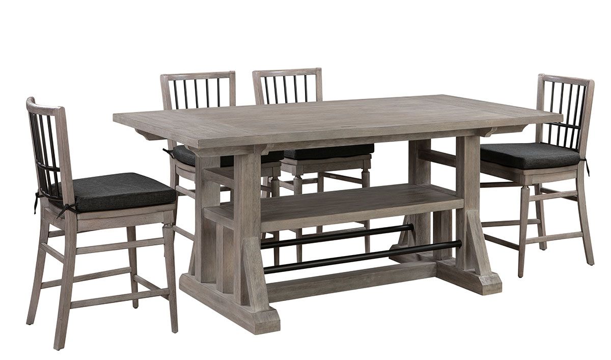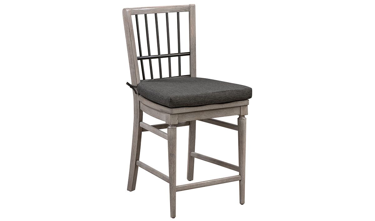 Whether you are adding to the East Hampton Counter Height Dining Set or just looking for a stylish, counter-height chair for an existing ensemble, the Designworks East Hampton Counter Height Gathering Chair brings an easy elegance to any setting. Carefully crafted from Rubberwood solids and Acacia veneers, this 42-inch high counter-height dining chair features a soft, Fieldstone Grey finish contrasted by a black metal back lattice for a modern take on the timeless look. Included with the chair is a plush seat cushion, in Jitterbug Gun Metal fabric.