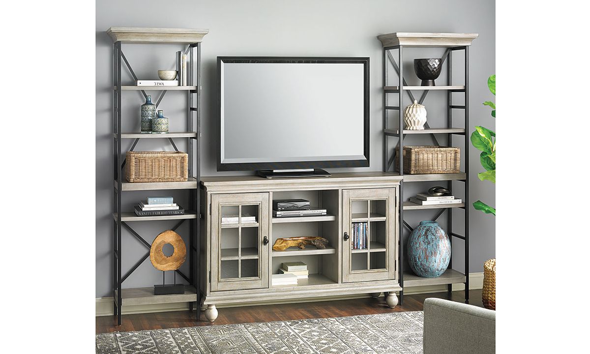 Create a living or entertainment room grounded in inviting, transitional style with the Designworks East Hampton 3-Piece Entertainment Wall Unit. The three-piece set, consisting of a center console flanked by two piers, is carefully crafted from Rubberwood solids and Acacia veneers with a weathered Fieldstone Grey finish, the piers featuring a powder coated steel frame for an industrial touch. The 66-inch wide center console balances timeless traditional styling, found in the crown molding, paneled cabinets and rounded bun feet, with ample storage options thanks to a large open shelving space in the center framed by two glass-paned cabinets housing two additional interior storage shelves. Perfect for displaying treasured keepsakes or decorative accents, the outer piers features five adjustable storage shelves to create a complete wall unit that compliments coastal, contemporary, traditional and rustic décor.