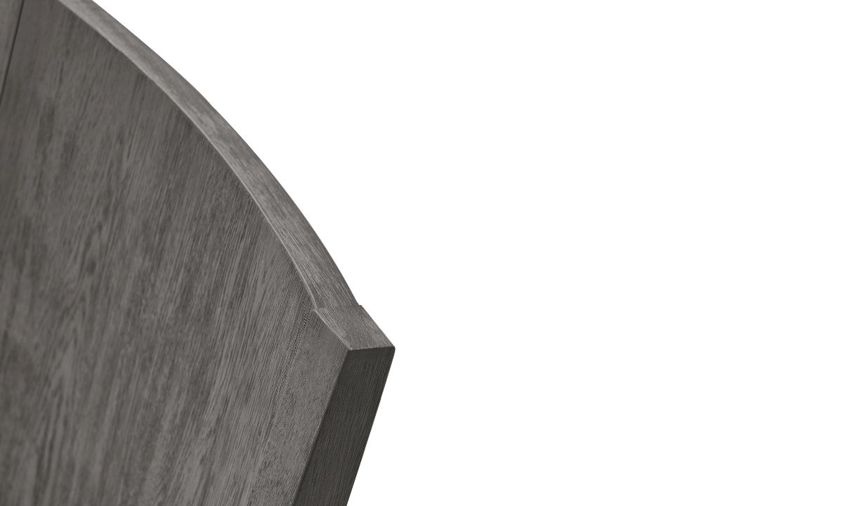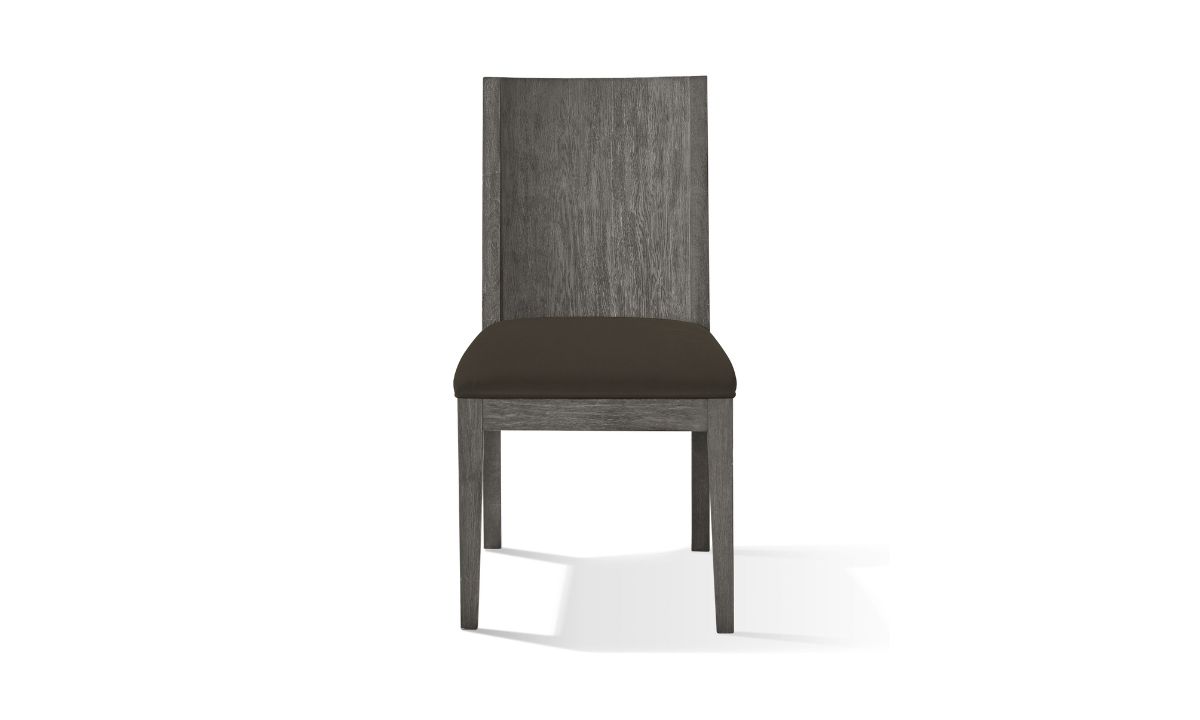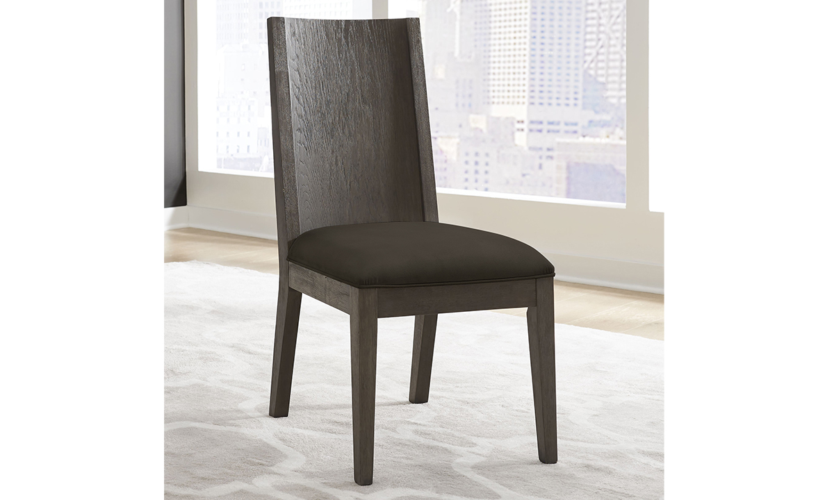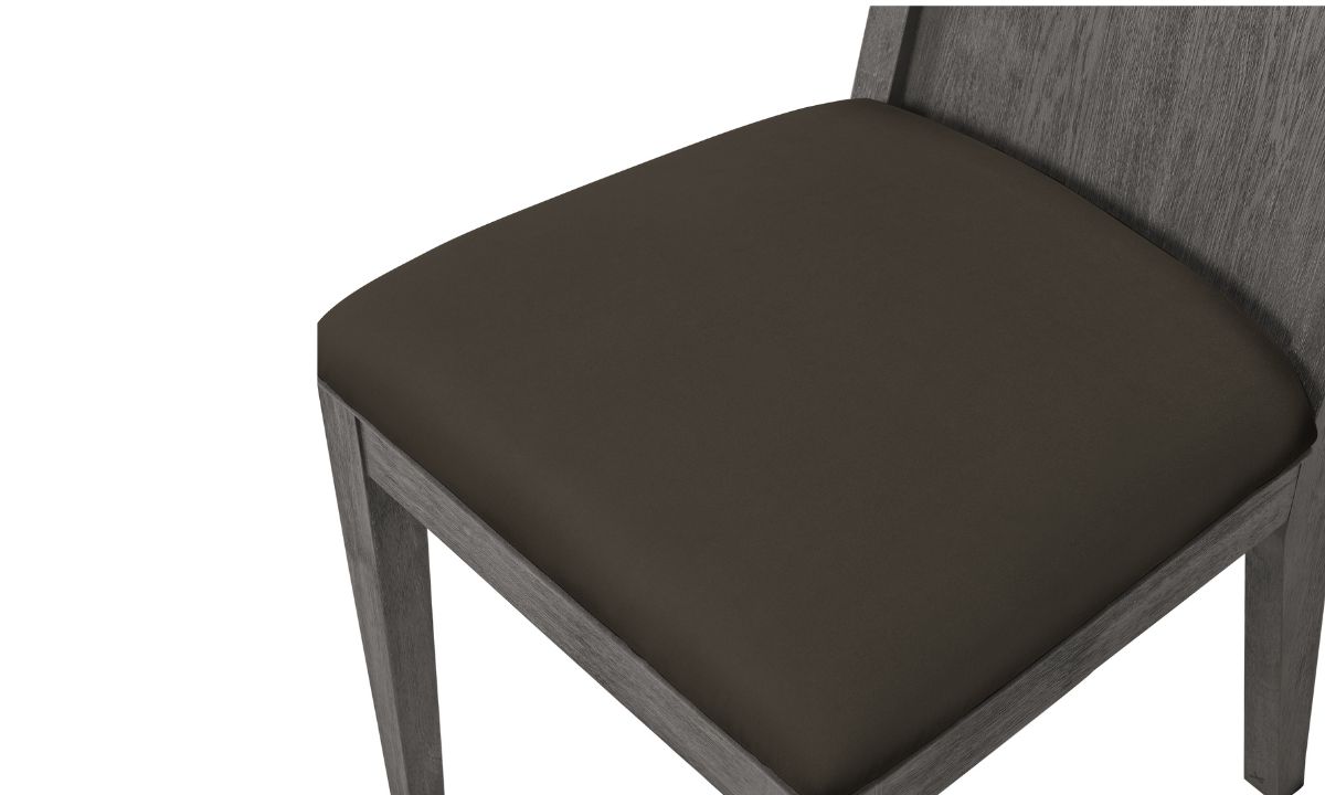 Stately and clean-lined, the Plata Thunder dining chairs from Modus are crafted from White Oak veneer in a brushed, Thunder Gray finish.
