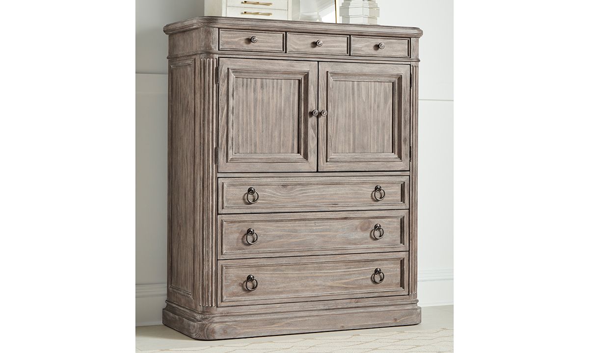 Settle in and cozy up to the softer side of classical décor with this modern twist on vintage. The Etienne Almond 6-Drawer Door Chest is a classically updated slice of bedroom heaven with a relaxed, casual tone that embraces old world craftsmanship like dovetail drawer construction, self-closing under-mount drawer guides and cedar-lined bottom drawers. This transformative collection gets much of its character from wire-brushed pine solids and veneer, hand glazed toast-tone almond finish and oil rubbed bronze hardware finish. This fully detailed chest features two panel doors, two adjustable shelves behind doors and six storage drawers for optimal utility.