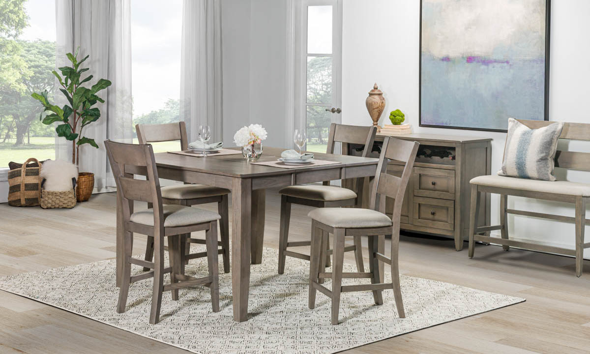 This 5-piece counter height dining room set from Davis Home features a table and four chairs, and is made with solid mango wood and a stunning Ohana Gray finish.