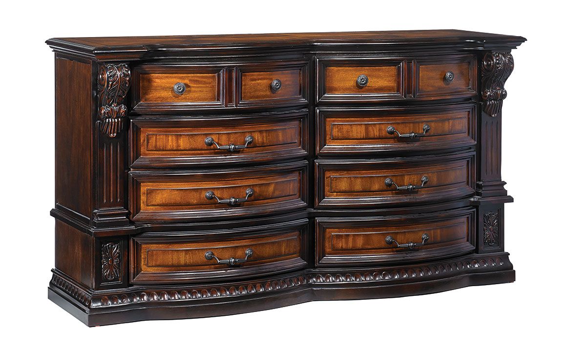 Complete your European-inspired bedroom ensemble with the heirloom-quality looks and craftsmanship of the Carnegie Manor 8-Drawer Dresser. Crafted from sturdy Poplar solids and striking Prima Vera veneers with Walnut inlays, this spacious 70-inch wide serpentine-front dresser is sealed in a rich, Dark Cinnamon finish. Inspired by the fine detailing found in handcrafted old-world antiques, this piece flaunts deep moldings along the paneled drawer fronts, flanked by fluted casings topped in intricately carved corbels, and is finished with ornate acanthus leaf pateras and carved gadrooning along the bottom rail.