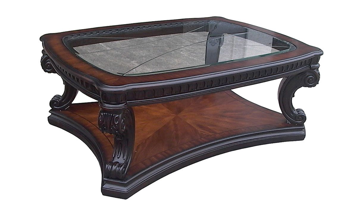 Center your living room or entertainment space around the Carnegie Manor Cocktail Table to anchor your ensemble in fine, traditional design. Carefully crafted from Poplar solids and Prima Vera veneers with striking Walnut inlays, the rich, Dark Cinnamon finish lends an inviting warmth and depth to this traditional 54-inch wide cocktail table. Inspired by old world, European designs, this piece pairs a thick glass inset tabletop with an egg-and-dart adorned table apron sitting on a striking C-scroll pedestal base, the four legs distinguished by ornate carvings.
