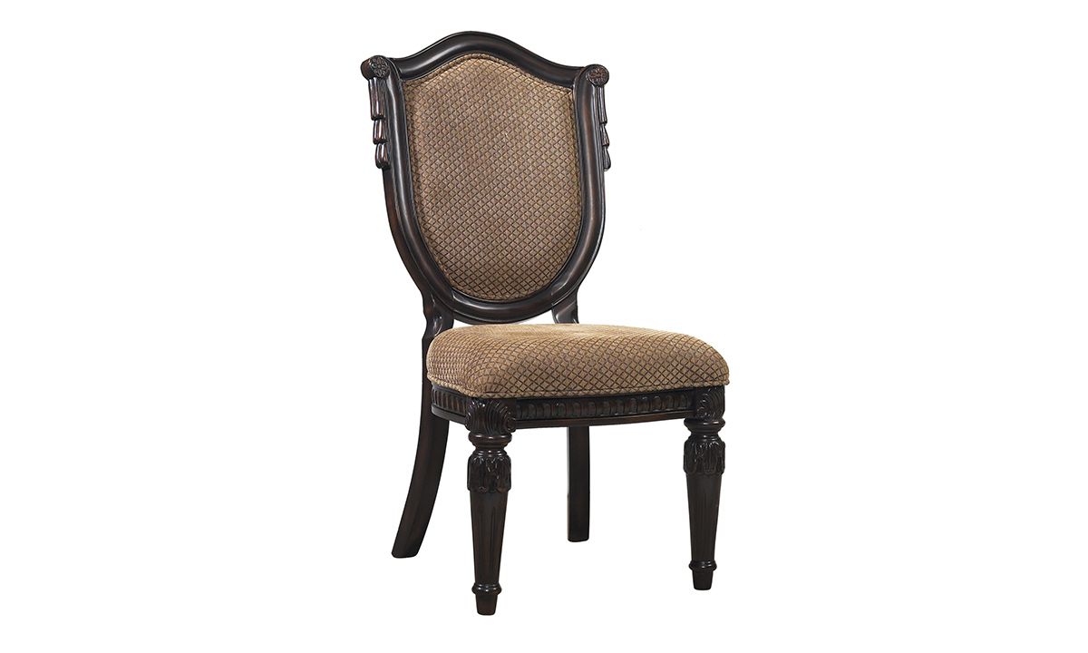 Recalling the elegant craftsmanship of old world, European designs, the Carnegie Manor I 5-Piece Dining Set with Upholstered Side Chairs breathes new life into the traditional style for an inviting look steeped in heirloom-quality sophistication. Crafted from Poplar solids and Prima Vera veneers with stunning Walnut inlays, the 72-inch wide table and four armless side chairs included in the set feature a warm and welcoming Dark Cinnamon finish. Capturing the true essence of old world design, the table features a C-scroll pedestal base with heavy dentil moldings, the curved legs festooned with traditional acanthus leaf carvings beneath the egg-and-dart accented apron on the expansive table top. The table also includes two 18-inch extension leaves to expand the table surface from 72 to 96 to 108 inches total, perfect for adapting to dinner parties small and large. Completing the ensemble, the four included side chairs echo the same detailed carvings found on the table and feature a fabric upholstered seat and back with a striking wood shield panel finished with a classic swag carving.
