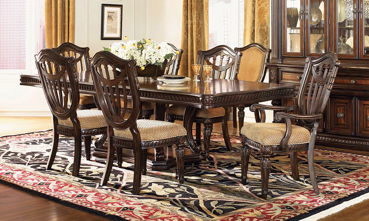 Recalling the elegant craftsmanship of old world, European designs, the Carnegie Manor I 5-Piece Dining Set with Wood Side Chairs breathes new life into the traditional style for an inviting look steeped in heirloom-quality sophistication. Crafted from Poplar solids and Prima Vera veneers with stunning Walnut inlays, the 72-inch wide table and four armless side chairs included in the set feature a warm and welcoming Dark Cinnamon finish. Capturing the true essence of old world design, the table features a C-scroll pedestal base with heavy dentil moldings, the curved legs festooned with traditional acanthus leaf carvings beneath the egg-and-dart accented apron on the expansive table top. The table also includes two 18-inch extension leaves to expand the table surface from 72 to 96 to 108 inches total, perfect for adapting to dinner parties small and large. Completing the ensemble, the four included side chairs echo the same detailed carvings found on the table and feature a fabric upholstered seat and striking shield-style back panel finished with a classic swag carving.